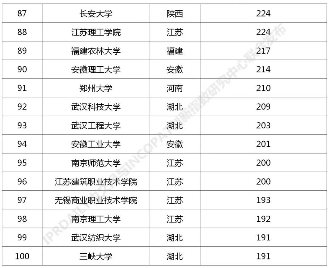 来源:IPRdaily中文网、incoPat创新指数研究中心 导读:近日,知识产权产业媒体IPRdaily与incoPat创新指数研究中心联合发布“中国高校专利转让排行榜(TOP100)”,前100名中国高校主要分布在江苏、北京、浙江、陕西、湖北、上海、广东等24个省市,国内专利转让数量均在191件及以上。其中南京林业大学以2531件专利位列第一,清华大学以2231件专利排名第二,上海交通大学以1548件专利排名第三。 当前,我国正在加快构建以国内大循环为主体,国内国际双循环相互促进的新发展格局,技术作为关键的生产要素,专利作为技术的主要载体,畅通技术要素流转渠道,提高专利资源配置效率,对于促进形成“双循环”新发展格局具有重要意义。2021年3月,财政部办公厅、国家知识产权局办公室发布《关于实施专利转化专项计划 助力中小企业创新发展的通知》,决定实施专利转化专项计划,利用三年时间,实现专利转化运用的激励机制更加有效、供需对接更加顺畅、转化实施更加充分、工作体系更加完善,专利技术转移转化服务的便利性和可及性显著提高,高校院所创新资源惠及中小企业的渠道更加畅通,中小企业创新能力得到大幅度提升,有力支撑知识产权密集型产业创新发展。 在此,我们对截至2021年3月31日,中国高校在中华人民共和国国家知识产权局登记生效的专利申请权/专利权转让数量(不含港澳台)进行了统计分析,以供参考。 中国高校专利转让排行榜(TOP100) 对截至2021年3月31日,中国高校在中华人民共和国国家知识产权局登记生效的专利申请权/专利权转让数量(不含港澳台)进行统计排名,前100名中国高校主要分布在江苏、北京、浙江、陕西、湖北、上海、广东等24个省市,国内专利转让数量均在191件及以上。其中南京林业大学以2531件专利位列第一,清华大学以2231件专利排名第二,上海交通大学以1548件专利排名第三。 数据整理:IPRdaily 数据来源:incoPat 中国高校国内专利转让技术分布 统计截至2021年3月31日,中国高校在中华人民共和国国家知识产权局登记生效的专利申请权/专利权转让数量(不含港澳台),通过IPC国际分类号分析该部分专利发现其主要围绕G01(测量;测试)、A61(医学或兽医学;卫生学)、G06(计算;推算;计数)、H01(基本电气元件)、C07(有机化学〔2〕)、H04(电通信技术)、C12(生物化学;啤酒;烈性酒;果汁酒;醋;微生物学;酶学;突变或遗传工程)、C08(有机高分子化合物;其制备或化学加工;以其为基料的组合物)、B01(一般的物理或化学的方法或装置)、A01(农业;林业;畜牧业;狩猎;诱捕;捕鱼)等技术领域分布。 数据整理:IPRdaily 数据来源:incoPat 排行榜说明: 排行榜统计截至2021年3月31日,中国高校在中华人民共和国国家知识产权局登记生效的专利申请权/专利权转让数量,包括发明、实用新型及外观设计专利,不包括香港、澳门和台湾的专利数据;专利公开公告日截至2021年3月31日,专利转让执行日截至2021年3月31日,转让信息包括专利权的继承或转让,不包括专利权人的变更;转让人统计高校和与该高校相关的分校区、附属校区、研究院、研究所、直属附属医院为转让人的专利,未包含与该高校相关的上级机构、校办企业、校属企业、合作企业、非直属附属医院、教学医院为转让人的专利。排行榜出现部分高校的专利件数相同,未做并排合并,是依据检索结果依次排列。以上排行榜仅为趋势参考。 |