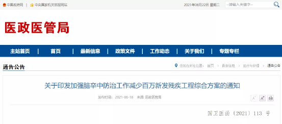 | 6月18日,国家卫健委发布《加强脑卒中防治工作减少百万新发残疾工程综合方案》(以下简称“《方案》”)。
