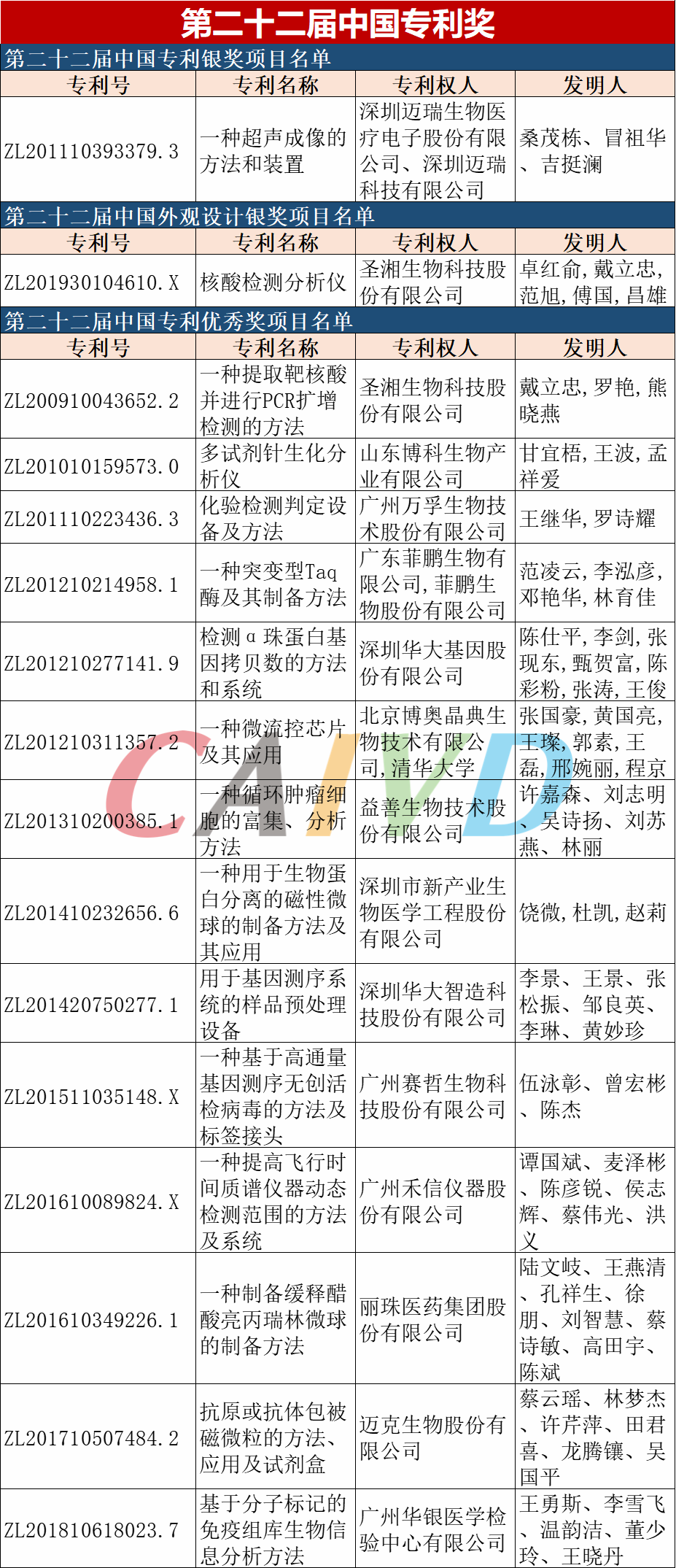 近日,国家知识产权局公布了第二十二届中国专利奖获奖名单。 根据《中国专利奖评奖办法》规定,经国务院有关部门知识产权工作管理机构、地方知识产权局、有关全国性行业协会,以及中国科学院院士和中国工程院院士等推荐,中国专利奖评审委员会评审,社会公示,国家知识产权局和世界知识产权组织决定授予30项发明、实用新型专利中国专利金奖,10项外观设计专利中国外观设计金奖;授予60项发明、实用新型专利中国专利银奖,15项外观设计专利中国外观设计银奖;授予825项发明、实用新型专利中国专利优秀奖,56项外观设计专利中国外观设计优秀奖;授予8家单位中国专利奖最佳组织奖,20家单位中国专利奖优秀组织奖,15位院士中国专利奖最佳推荐奖。 在体外诊断领域中,有多家体外诊断相关企业上榜:迈瑞医疗荣获第二十二届中国专利银奖;圣湘生物荣获第二十二届中国外观设计银奖;圣湘生物、博科生物、万孚生物、菲鹏生物、华大、新产业生物、丽珠医药、迈克生物等荣获第二十二届中国专利优秀奖(排名不分先后,如下图)。 |
