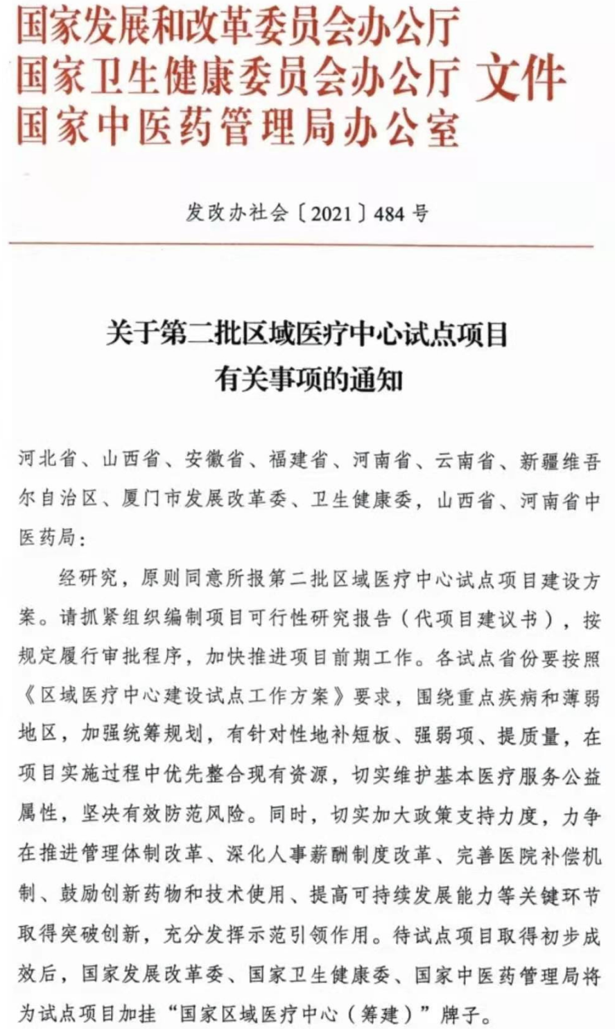 近日,国家发展改革委、国家卫健委、国家中医药管理局联合下发《关于第二批区域医疗中心试点项目有关事项的通知》,此次获批的项目共有16个,包含有福建4家,河南3家,河北、山西、新疆、云南各2家,安徽1家。