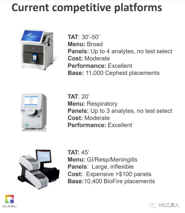 扩展,4合一 试剂卡 一个试剂卡有4个独立通道,每个通道可以分析3种靶标,所以一次测试可以在不到 30 分钟的时间内分析多达 12 种病原体或靶标,包括对照在内。 再看下一哥对市场的分析 一哥眼里新冠之后分子试剂的机会 Quidel眼中的对手,也是国内POCT 分子要赶超的目标 2019的投资报告中,提到了试剂卡成本,要小于5美刀 5美刀!在国外还是很有竞争力啊!就算是拿到国内,也不算弱!行家一出手,便知有没有!POCT扛把子都杀进分子多联检了,你家还等啥呢? 声明:以上信息和图片来自Quidel官网和2020投资报告,仅用于分享,如涉及版权等问题,请尽快联系我们,我们第一时间更正或删除,谢谢! |