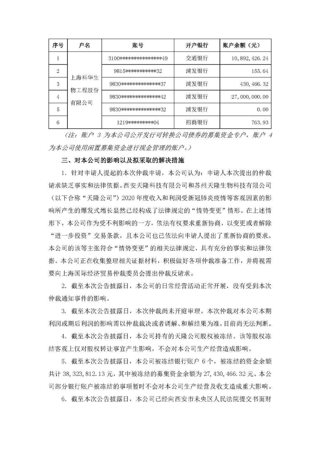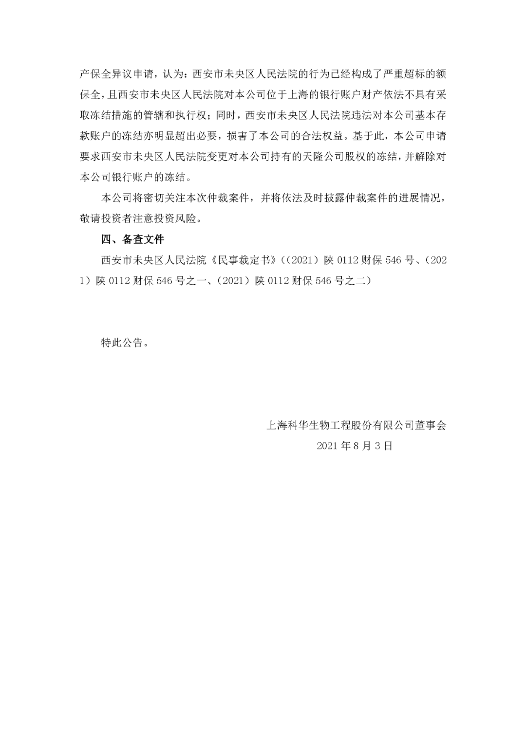 8月3日,科华生物发布公告,披露收到民事裁定书。 针对之前科华与天隆的仲裁事件,大意是天隆股东向上海仲裁委申请财产保全,仲裁委将保全申请书等材料提交西安市未央区人民法院。法院判决冻结科华生物多个银行账户资产一年,查封科华生物在西安天隆和苏州天隆的62%的股权,期限为三年。以上保全标的为1,015,532,113.92 元。 科华生物回应: 1、本公司正在收集整理相关证据材料,积极做好各项仲裁准备工作,并将视需要向上海国际经济贸易仲裁委员会提出仲裁反请求。 2、本公司的日常经营活动正常开展,没有受到本次仲裁通知事件的影响。 3. 本次仲裁尚未开庭审理。本次仲裁对本公司本期利润或期后利润的影响需以仲裁裁决或者调解、和解结果为准,目前尚无法判断。 4.本公司持有的天隆公司股权被冻结。该等股权冻结客观上仅对股权转让事宜产生影响,不会对本公司生产经营造成影响。 5.本公司被冻结银行账户 6 个,被冻结的资金余额共计 38,323,812.13 元,其中被冻结的募集资金余额为 27,430,466.32 元。本公司部分银行账户被冻结的事项暂时不会对本公司生产经营及收支造成重大影响。 6.截至本次公告披露日,本公司已经向西安市未央区人民法院提交书面财产保全异议申请,认为:西安市未央区人民法院的行为已经构成了严重超标的额保全,且西安市未央区人民法院对本公司位于上海的银行账户财产依法不具有采取冻结措施的管辖和执行权;同时,西安市未央区人民法院违法对本公司基本存款账户的冻结亦明显超出必要,损害了本公司的合法权益。基于此,本公司申请要求西安市未央区人民法院变更对本公司持有的天隆公司股权的冻结,并解除对本公司银行账户的冻结。 以下为公告原文: |