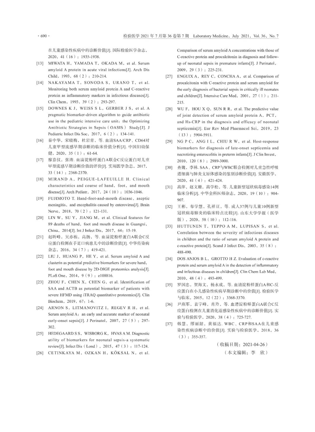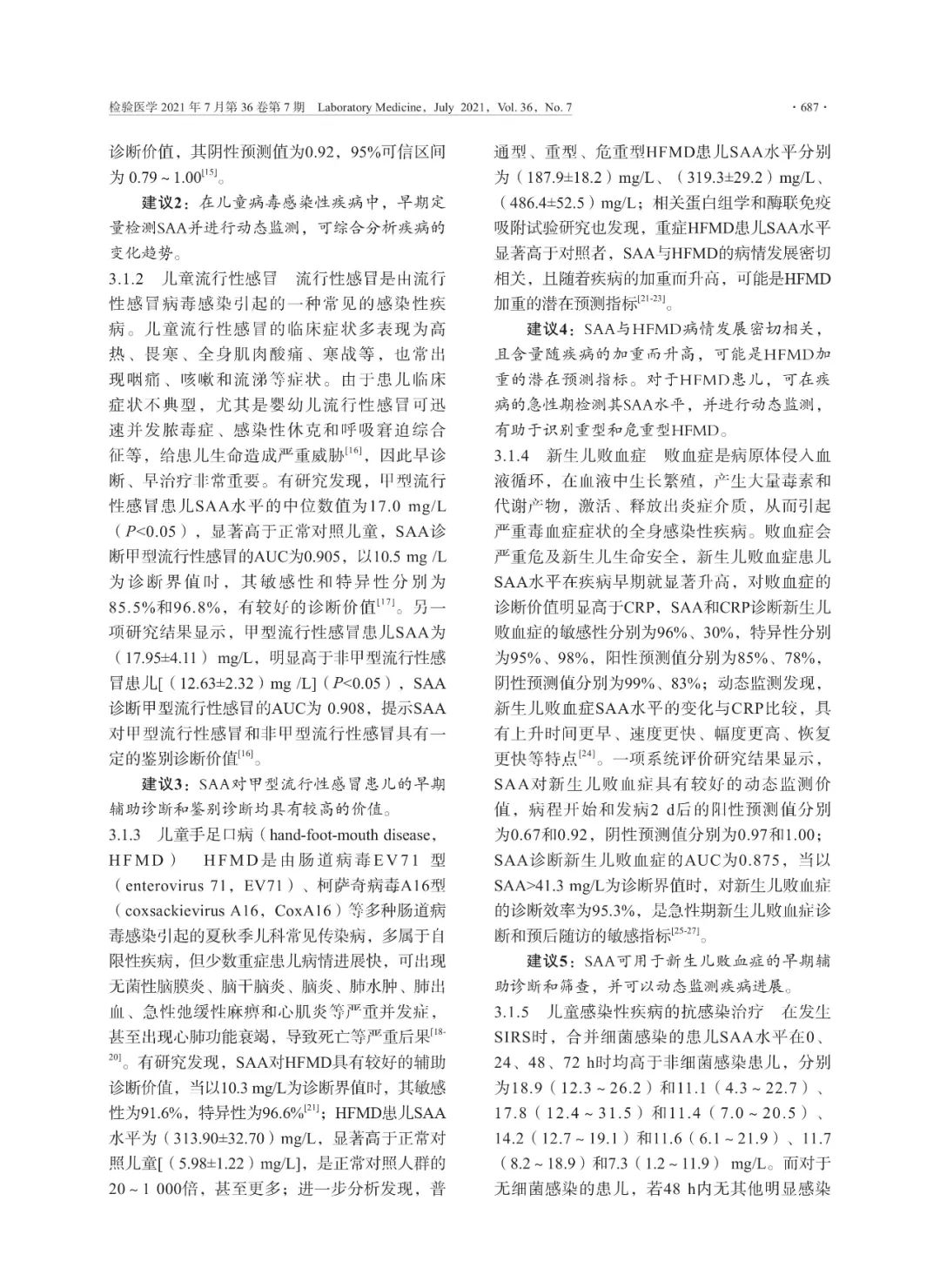 摘要: 感染性疾病是儿科常见病、多发病,严重威胁儿童健康。早期识别和诊断对儿童感染性疾病的治疗和预后具有重要意义。血清淀粉样蛋白A(SAA)和C反应蛋白(CRP)均是由肝细胞合成的急性时相反应蛋白,参与机体的免疫调节 ...