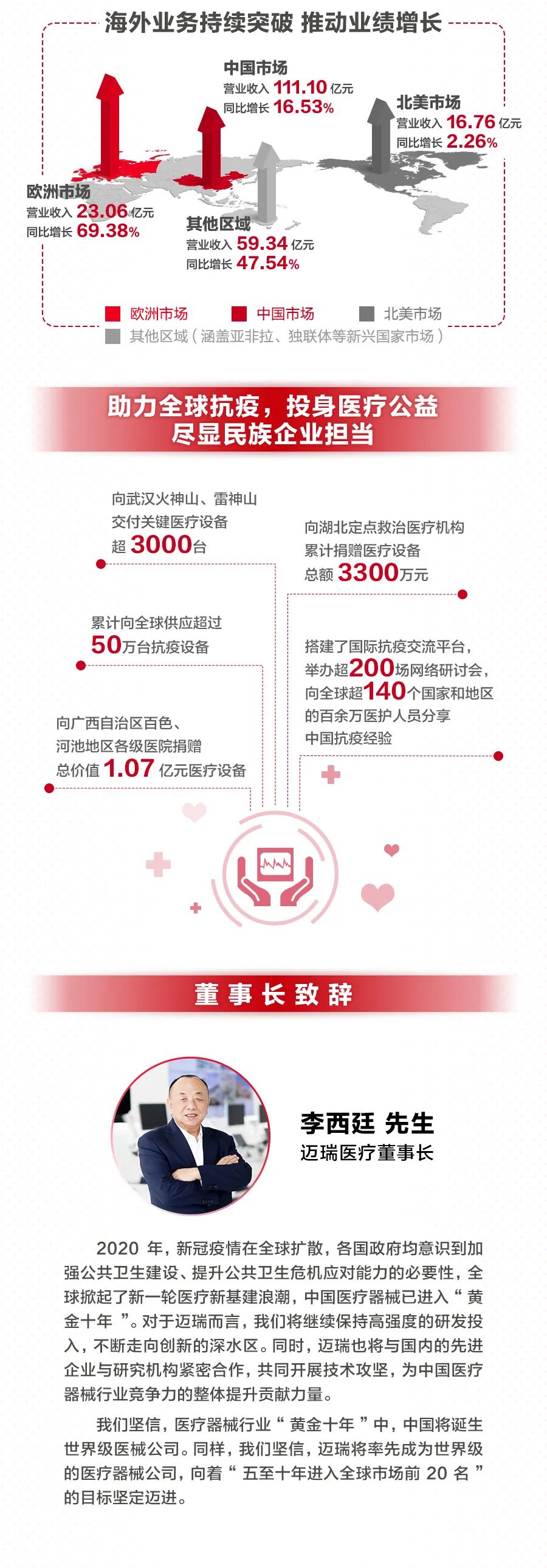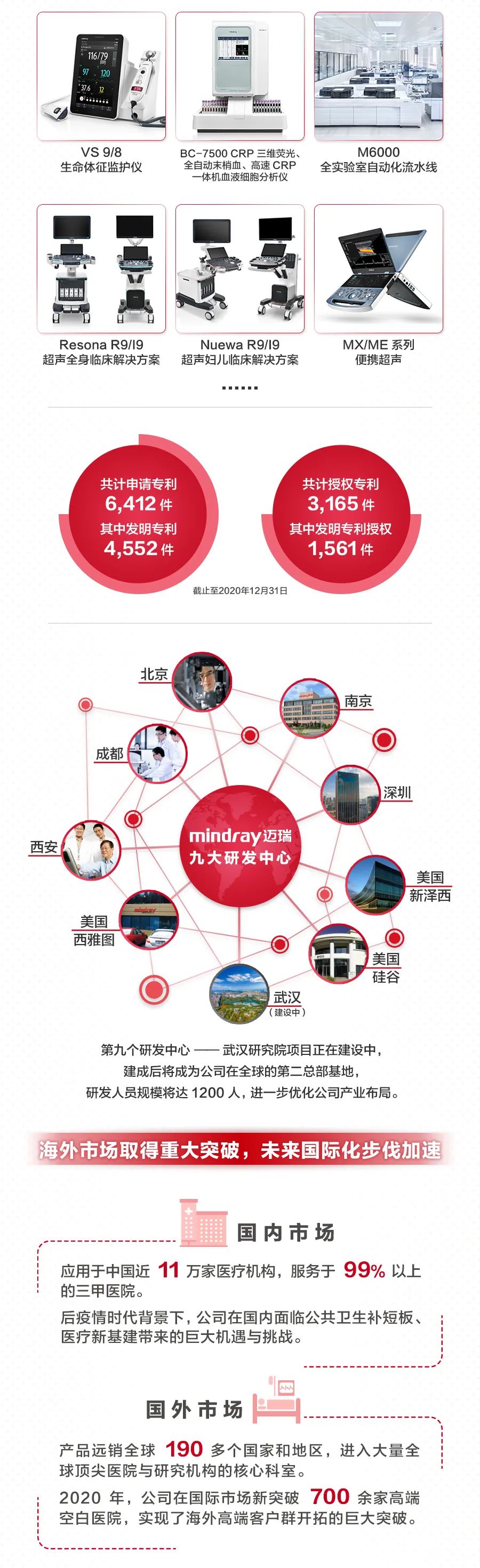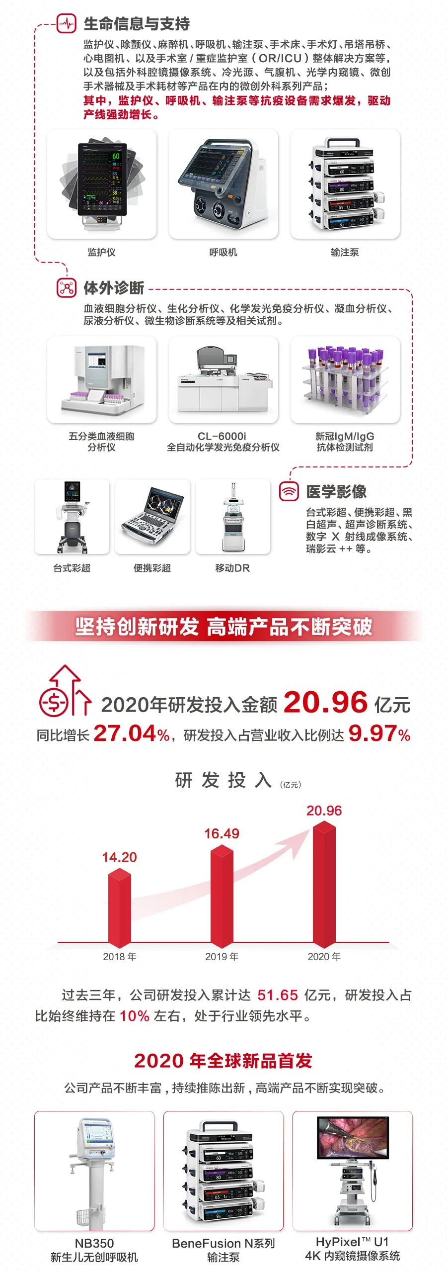 近年来,迈瑞医疗始终坚持自主创新,不断加大研发投入。报道中,迈瑞医疗董事长李西廷表达了对加大创新力度的决心:“(迈瑞医疗)2020年研发投入比上一年增加27%,达到21亿元。过去3年我们整个在研发的投入是52亿,研发人员超过3000多人。(未来)我们希望能够再加大一些,就是牺牲一点当年的利润,也要把研发做好。” 目前,迈瑞已建立起基于全球资源配置的研发创新平台,设有九大研发中心,共有3070名研发工程师,分布在深圳、武汉、南京、北京、西安、成都、美国硅谷、美国新泽西和美国西雅图。高研发投入也带来了产品在高端市场的突破和优异的市场表现。该报道介绍,国内市场方面,目前迈瑞医疗的监护仪、麻醉机、呼吸机、除颤仪、输出泵等产品市场占有率已位居前列。2020年,迈瑞医疗完成了全球700多家高端客户的突破。在国内市场,迈瑞医疗的产品在覆盖中国近11万家医疗机构和99%以上的三甲医院的基础上,产品渗透率进一步提升,同时覆盖医疗机构的范围进一步扩大。