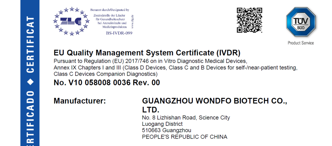 近日,万孚生物获得由TüV 南德意志集团签发的欧盟质量管理体系证书(IVDR)。同时,万孚生物的糖化血红蛋白检测试剂盒(免疫荧光分析法)和 C 反应蛋白检测试剂盒(免疫荧光分析法)等产品也获得了 IVDR CE 证书。 其中,万孚生物 IVDR 质量管理体系证书为国内首个 POCT 领域 IVDR 质量管理体系证书,糖化血红蛋白检测试剂盒、C 反应蛋白检测试剂盒成为国内首批获得 IVDR CE 认证的 NPT (NearPatient Testing ,近患者检测)产品。 质量管理体系 IVDR 证书的获得,使万孚生物成为欧盟新体外诊断医疗器械法规 IVDR CE 认证的医疗器械制造商,为万孚生物后续的欧盟认证切换工作奠定了坚实的基础。 本次获颁的 IVDR CE 证书是万孚生物在 IVDR CE 体系下获得的首批证书,上述产品也是国内首批获得 IVDR CE 认证的NPT产品,监管级别均为C类。根据欧盟相关规定,医疗器械监管级别分为ABCD四类,D类为最严监管。在更严的监管下,上述产品可在欧盟市场的专业场景和床旁场景同时销售,对万孚生物在欧盟地区的业务推广将产生积极影响。 据了解,CE认证作为产品进入欧洲市场的“签证”,是欧盟市场对于产品准入的强制性要求。自2022年5月26日,欧盟将全面实施体外诊断医疗器械法规EU 2017/746 (IVDR )。 IVDR的正式实施,在技术文档审查、临床评估、上市后监管等各方面都提出了更严格的要求,标志着欧盟当局对医疗设备领域监管的加强,同时也预示着欧盟各成员国在医疗器械监管的尺度将得到进一步的统一。 |
