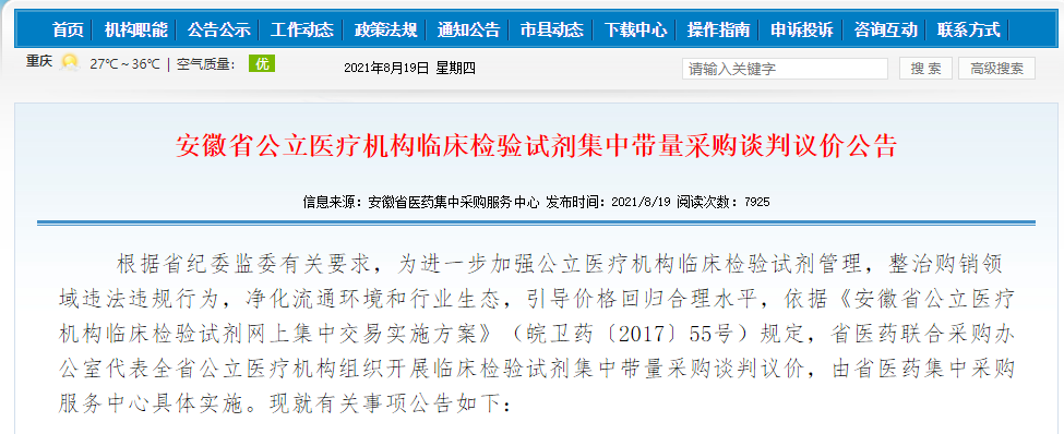 这一切都是由于昨天发布的IVD行业震撼弹:安徽省医药集中采购服务中心突然推出了省级检验试剂带量集采公告。