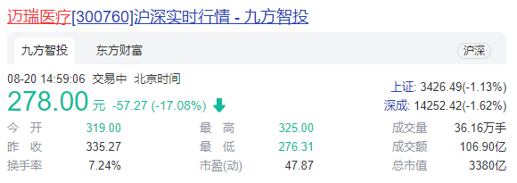 昨日大批医疗企业现跳水式下跌,其中三家医疗器械企业迈瑞医疗、新产业、安图生物股价跌幅最大: