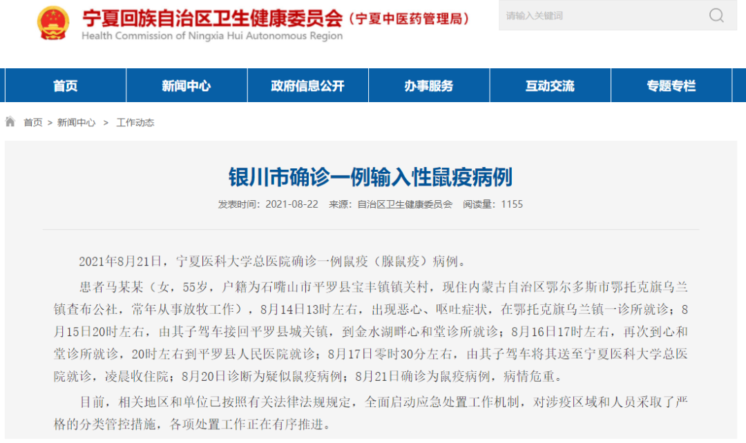 | 宁夏卫健委通报称,2021年8月21日宁夏医科大学总医院确诊一例鼠疫(腺鼠疫)病例。 患者马某某(女,55岁,户籍为石嘴山市平罗县宝丰镇镇关村,现住内蒙古自治区鄂尔多斯市鄂托克旗乌兰镇查布公社,常年从事放牧工作),8月14日13时左右,出现恶心、呕吐症状,在鄂托克旗乌兰镇一诊所就诊;8月15日20时左右,由其子驾车接回平罗县城关镇,到金水湖畔心和堂诊所就诊;8月16日17时左右,再次到心和堂诊所就诊,20时左右到平罗县人民医院就诊;8月17日零时30分左右,由其子驾车将其送至宁夏医科大学总医院就诊,凌晨收住院;8月20日诊断为疑似鼠疫病例;8月21日确诊为鼠疫病例,病情危重。 根据《国家鼠疫控制应急预案》,宁夏回族自治区政府决定自2021年8月22日1时起,启动鼠疫疫情防控四级应急响应,全力救治患者,全面落实综合防控措施,确保疫情不传播、不扩散。据不完全统计,近一年来,我国已发生多起人确诊鼠疫病例: