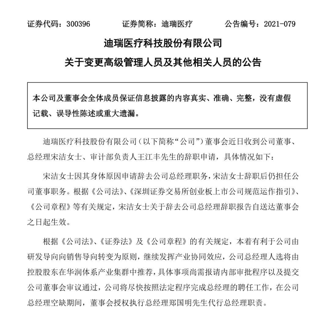 迪瑞医疗:总经理宋洁提出辞职 新总经理将从华润产业中委派