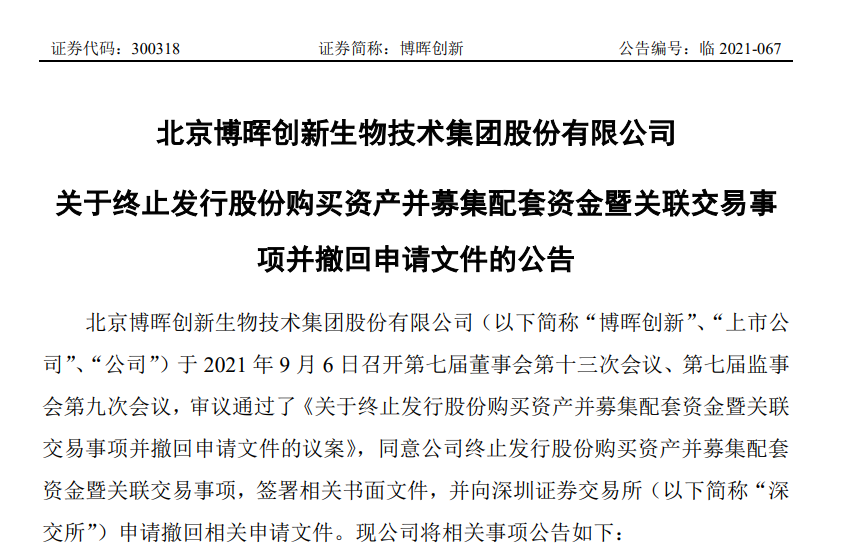 2021年9月7日,北京博晖创新生物技术股份有限公司发布公告,受疫情持续影响收购进程,公司决定终止向珠海奥森发行股份购买其持有的上海博森100%股权,及向珠海奥森以非公开发行股份的形式募集配套资金的相关事宜。
