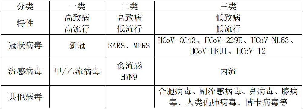 在上一篇《呼吸道感染常见病毒与检测方案精析(上)》文中,我们提到呼吸道病毒引起的感染占到了呼吸道感染的90%以上,而各种致病病毒可以按照其致病性和流行性大致归纳如下:
