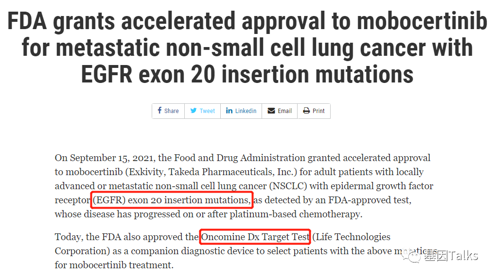 " 近日,FDA再批EGFR ex20ins突变靶向药物,用于治疗铂类化疗期间或之后疾病进展且携带EGFR ex20ins突变的局部晚期或转移性NSCLC患者。这是FDA批准的第二款EGFR ex20ins突变靶向药物,也是第一款针对EGFR ex20ins突变的口服疗法(上次是输注疗法)。 2021年9月15日,FDA加速批准mobocertinib(Exkivity,武田制药)用于治疗铂类化疗期间或之后疾病进展且携带EGFR ex20ins突变的局部晚期或转移性NSCLC成人患者。4 这是FDA批准的第二款EGFR ex20ins突变靶向药物,也是第一款针对EGFR ex20ins突变的口服疗法(EGFR酪氨酸激酶抑制剂,EGFR-TKI)。 同时,FDA又为赛默飞世尔旗下Life Technologies公司的Oncomine Dx Target Test (ODxTT,23基因DNA+RNA检测panel)开了绿灯,批准其作为mobocertinib的伴随诊断,以鉴定符合mobocertinib治疗的EGFR ex20ins突变NSCLC患者。4 主要疗效终点是盲法独立审查委员会(BICR)根据RECIST 1.1确定的总缓解率(ORR)和缓解持续时间(DoR)。ORR为 28%(95% CI: 20%,37%),DoR为 17.5个月(95% CI: 7.4, 20.3),59%患者的缓解持续时间(DOR)超过6个月。 最常见的不良反应 (>20%) 是腹泻、皮疹、恶心、口腔炎、呕吐、食欲下降、甲沟炎、疲劳、皮肤干燥和肌肉骨骼疼痛。 基于此,FDA批准Life Technologies公司的组织活检产品Oncomine Dx Target Test 作为mobocertinib的伴随诊断,以鉴定符合mobocertinib治疗的EGFR ex20ins突变NSCLC患者。 Oncomine Dx Target Test是一款肿瘤NGS检测产品(ODxTT,23基因DNA+RNA检测panel),最初于2017年首次被FDA批准用于伴随诊断。现在它已被FDA批准用于五种非小细胞肺癌(NSCLC)靶向药物/方案(达拉非尼+曲美替尼,克唑替尼,吉非替尼,pralsetinib,mobocertinib)和一种胆管癌(CCA)靶向药物( ivosidenib)的伴随诊断。该产品目前还在超过15个国家/地区获得批准,包括美国、欧洲各国、日本、韩国和中东。 EGFR ex20ins突变罕见,NSCLC中发生率1~3%。 如果发生漏检,对患者和药企来说都是重大“损失”。 所以,如何更准确的鉴定这部分罕见突变患者,将显得尤为重要。 此前研究人员评估了RT-PCR方法和NGS方法在美国NSCLC患者中全面鉴定EGFR ex20ins突变的能力,为此,分析了两个真实世界的数据【RWD】,即AACR项目肿瘤形成基因组学证据信息交换(GENIE)数据库和FoundationInsights数据库。 RT-PCR的商业化检测试剂盒为therascreen 和cobas。 两个数据库的结果分别表明:RT-PCR方法遗漏了大约一半(50%)的NGS识别的EGFR ex20ins突变的患者,根据NGS检测,发现有40-102种独特(各种各样)的ex20ins突变形式。5 总的来说,EGFR ex20ins突变在分子上具有异质性,NGS方法已鉴定出100种以上的变异形式,PCR方法会漏检50%左右。如果NSCLC患者想进行EGFR ex20ins突变的检测,建议行NGS方法的检测,组织、血液或胸水均可,因为FDA批准的两个EGFR ex20ins突变靶向药物的伴随诊断分别就是基于血液(G360 CDx,检测55基因)和组织(Oncomine Dx Target Test,检测23基因)的NGS检测,临床入组的时候还用到了胸水样本。 参考资料: 1.Riess JW, Gandara DR, Frampton GM, Madison R, Peled N, Bufill JA, Dy GK, Ou SI, Stephens PJ, McPherson JD, Lara PN Jr, Burich RA, Ross JS, Miller VA, Ali SM, Mack PC, Schrock AB. Diverse EGFR Exon 20 Insertions and Co-Occurring Molecular Alterations Identified by Comprehensive Genomic Profiling of NSCLC. J Thorac Oncol. 2018 Oct;13(10):1560-1568. 2.Fang, W., Huang, Y., Hong, S. et al. EGFR exon 20 insertion mutations and response to osimertinib in non-small-cell lung cancer. BMC Cancer 19, 595 (2019). 3.https://www.fda.gov/news-events/press-announcements/fda-approves-first-targeted-therapy-subset-non-small-cell-lung-cancer 4.https://www.fda.gov/drugs/resources-information-approved-drugs/fda-grants-accelerated-approval-mobocertinib-metastatic-non-small-cell-lung-cancer-egfr-exon-20 5.Bauml JM et al., Underdiagnosis of EGFR exon 20 insertion mutation variants: estimates from NGS-based real-world datasets. WCLCL 2020, FP07.12 |
