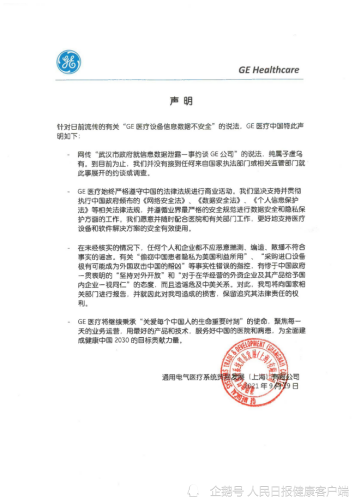 来源:人民日报健康客户端 作者:健康时报记者王振雅 近期,网传“武汉政府约谈GE,GE涉及数据泄密,武汉协和超声下网……”对此,GE医疗中国发表声明称,网传“武汉市政府就信息数据泄露一事约谈GE公司”的说法,纯属子虚乌有。9月23日,健康时报记者向华中科技大学附属协和医院超声影像科、放射科多位医生证实,该院GE医疗设备均正常使用,没有下网的通知。 GE医疗一位工作人员告诉记者,“这些内容纯属谣言,已经辟谣了。GE公司没有被约谈,且合规守法。公司已经发布了声明并且对不实谣言采取了投诉、报警、发律师函等法律行动。最早写这个内容的文章已经下架。” 此外,华中科技大学附属协和医院超声影像科主任医师杨亚利告诉健康时报记者,医院GE的超声设备均正常使用,科室并未接到下网、停止使用的通知。关于GE被武汉政府约谈的消息,也没有听说过。 华中科技大学附属协和医院放射科副主任梁波也表示,我们科室开展CT使用最频繁的就是GE的设备,目前都是正常使用,没有收到下网、停止使用的情况。当然,病人的数据我们都是非常严格保护,目前不存在数据泄露的情况。 |