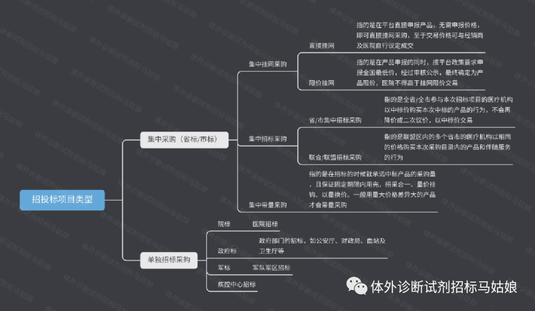 1、省标:省级挂网采购/集中招标采购 2、市标:市级挂网采购/集中招标采购 3、大型联合各地市/联盟招标:几个地级市或几个省联合招标 4、院标:医院招标 5、政府标:政府部门的招标,如公安厅、财政局、血站及卫生厅等 6、军标:军队军区招标 7、疾控中心招标