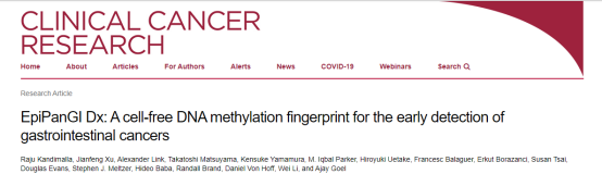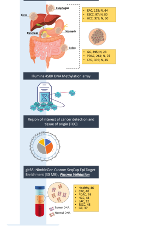 | 根据世界卫生组织国际癌症研究机构(IARC)最新发布的《2020年全球最新癌症负担数据》显示:2020年全球新发癌症病例1929万例,其中中国新发癌症457万人,占全球23.7%,高居全球第一。从最新的数据来看,前十大癌症有5种属于消化系统肿瘤,且发病人数与死亡人数逐年递增,胃肠道癌占中国癌症相关死亡人数的45%,全球几乎一半的胃癌、食管癌和肝癌的新增病例和死亡病例在中国。中国消化系统肿瘤负担极重,承受着巨大的癌症发病率和死亡率负担。提高癌症防治认知提升早筛早诊意识,其中癌症的早筛早诊是降低癌症负担的重要举措。现有的癌症检测缺乏精准便捷的方法,主要依赖于内镜或者影像学,肿瘤标记物作为补充手段,目前尚没有可一次性检测所有消化系统癌症的方式。在传统的消化系统癌症筛查手段中,内镜检查侵入性强、患者依从性低,影像学检查分辨率不足、难以区分癌症与其它病变,肿瘤标志物检查则灵敏性、特异性较差。随着液体活检技术的发展,血液样本作为接受度更高的样本,无疑成为更好的选择。然而目前市场上成熟的血液检测产品以单个癌种检测为主,尚没有血液检测方式可以对多个消化系统癌症进行早期联合检测。新方法:基于血液DNA甲基化检测可同时检测多个癌种近日,美国贝勒大学医学中心在clinicalcancer research上发表了一篇文章:EpiPanGIDx: A cell-free DNA methylation fingerprint for the early detection ofgastrointestinal cancers。实验人员通过公共数据库,收集并研究了450K甲基化芯片数据共1781个样本,包括结直肠癌CRC、肝癌(HCC)、食管鳞状细胞癌(ESCC)、胃癌(GC)、食管腺癌(EAC)和胰管腺癌(PDAC)六种不同的胃肠道癌症。通过研究每种胃肠道癌症的肿瘤和正常组织的数据,最终通过对六种GI癌症全基因组的DNA甲基化研究确定了一种非侵袭性血浆DMR panel EpiPanGI Dx模型,该模型可以一次性全面检测GI癌症,还具有揭示组织起源的能力,更能够高精度预测所有GI癌症的组织来源。
