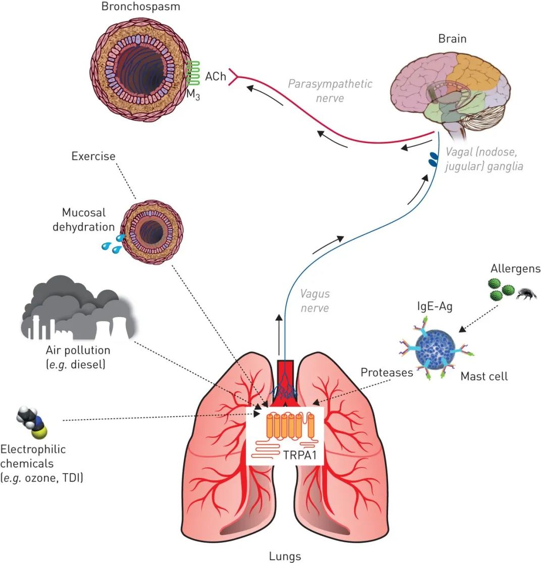 ▲TRP离子通道介导因为多种刺激性化合物引起的哮喘反应(图片来源:参考资料[3])TRPM8则从另一种角度参与咳嗽发生:有时我们在吸入冷空气后,也会忍不住的咳嗽。然而由于TRPM8的激活剂是薄荷醇,而薄荷醇本身有抑制咳嗽的作用,所以其背后的机理研究进展较为困难。科学家们要阐明的第一个问题,或许是薄荷醇的咳嗽抑制作用,究竟是否通过TRPM8来实现。如果使用TRPM8抑制剂,或许能帮助我们更好地理解这条通路在咳嗽中的作用。