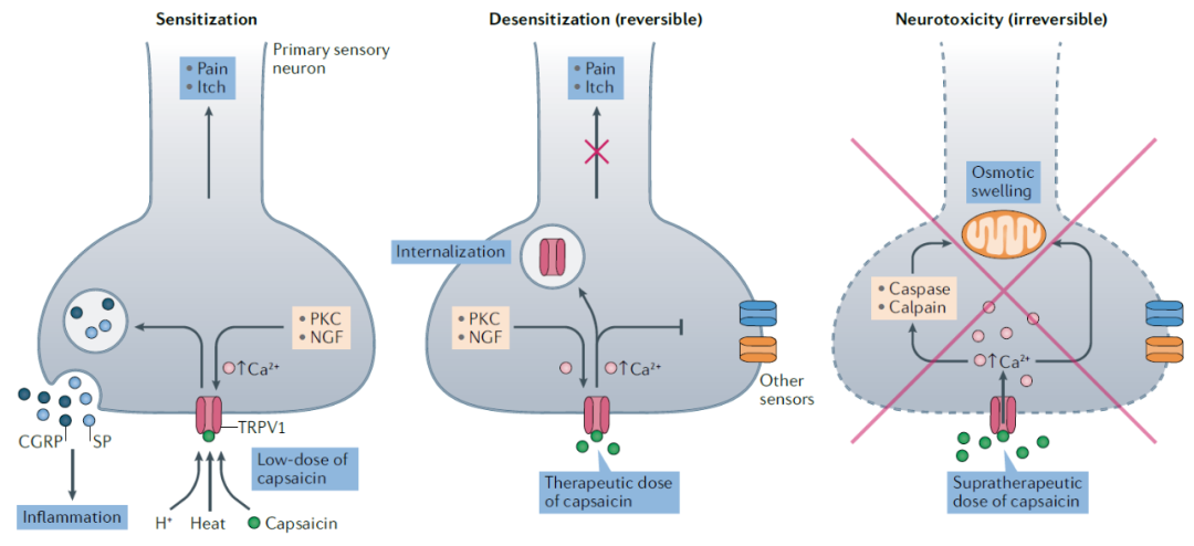 ▲不同剂量的辣椒素对TRPV1受体和表达它们的神经细胞具有不同的作用(图片来源:参考资料[2])