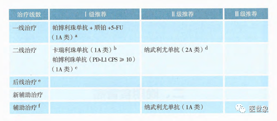 • 纳武利尤单抗联合化疗(1A类证据,PD-L1 CPS≥5)为一线治疗I级推荐。