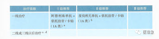 • 度伐利尤单抗+依托泊苷/卡铂(1A类证据)为一线治疗II级推荐