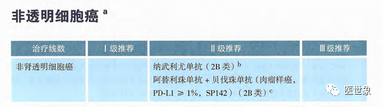 • 纳武利尤单抗(2B类证据),阿替利珠单抗+贝伐珠单抗(肉瘤样癌,PD-L1≥1%,SP142)(2B类证据)为非肾透明细胞癌治疗II级推荐。