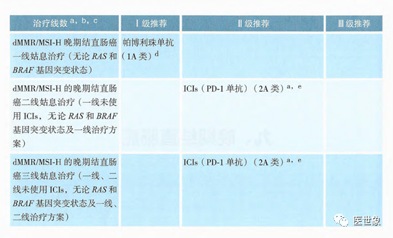 • dMMR/MSI-H的晚期结直肠癌二线姑息治疗(一线未使用ICIs,无论RAS和BRAF基因突变状态及一线治疗方案)、dMMR/MSI-H的晚期结直肠癌三线姑息治疗(一线、二线未使用ICIs,无论RAS和BRAF基因突变状态及一线、二线治疗方案)的II级推荐均为ICIs(PD-1单抗)(2A类证据)。