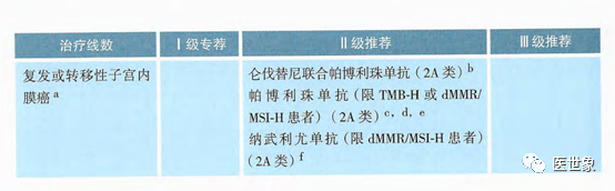 • 仑伐替尼联合帕博利珠单抗(2A类证据),帕博利珠单抗(限TMB-H 或dMMR/ MSI-H患者)(2A类证据),纳武利尤单抗(限dMMR/MSI-H患者)2A类证据)为II级推荐;
