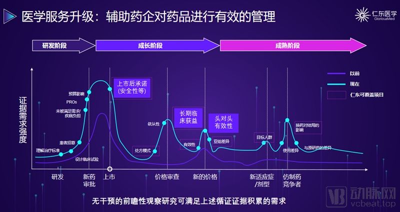 在药企的连接方面,仁东医学已经有能力承接大量药品上市后的前瞻性队列研究,比如上市后再评价、处方模式以及目标人群研究。在临床前的研发阶段,仁东医学也开始与恒瑞医药、誉衡药业等国内知名药企合作,探索切入临床前研发阶段的可能性。