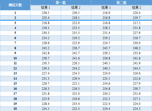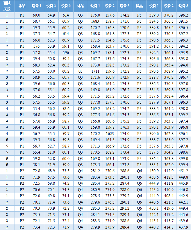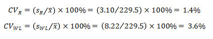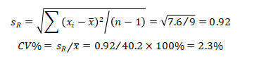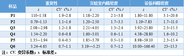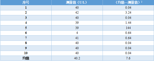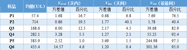 这是刘博谈准确度第八篇,本篇举例说明如何计算精密度。 7、举例说明如何计算精密度 7.1、重复性(批内精密度) 以丙氨酸氨基转移酶试剂盒产品其中一个批号试剂对低值样品进行测量为例,结果如表4.3.5所示。 表5|批内精密度实验原始数据记录表 表4.3.5中数据根据6.3.3标准进行分析显示无离群值。 根据公式(1)求出均值,均值为40.2 U/L,根据公式(2)计算出批内估计值的标准差。 丙氨酸氨基转移酶批内精密度为2.3%。 7.2、批间差 以白蛋白试剂盒产品为例,取3个不同批号的试剂,在质控合格的前提下对同一份样品进行测量,结果如表6。 表6|白蛋白试剂盒产品批间精密度实验原始数据记录表(单位:g/L) 表6中数据根据6.3.3标准分析显示3个批号测量白蛋白结果均无离群值。 根据公式(3)计算极差: 该白蛋白试剂盒产品的批间精密度为4.2%。 7.3、重复性和实验室内精密度(单点精密度)实例分析 本实例为单点精密度评价的数据分析,考虑到实验中可能会测量多个浓度样品,下面仅以其中一个样品的数据为例进行分析,原始数据记录详见表7。 实验设计遵循经典的20×2×2设计:使用一个试剂批号;使用一个测量系统;测试20天;每天测试2批;每批测试2次。 表7|超氧化物歧化酶( SOD )精密度评价原始数据记录表 (单位:U/mL) 80个数据来源于20天的重复测试,每批检测样品均来自同一份分装后的样品,可排除样品前处理或操作者的影响。无丢失数据,是一个平衡数据集。 为了观测异常结果,将每天每批每次重复测量的结果作图,如图1所示。 图1|超氧化物歧化酶精密度评价。代表20天每天2批、每批2次的测量结果,其中方形的点代表第一批测试结果,圆形的点代表第二批测试结果 从图1可以看出,无明显异常值。数据根据6.3.3标准进行统计分析,显示无离群值。 数据通过公式(4)~公式(8) 研究结果采用双因素嵌套方差分析,各变异来源的均方和结果见表8。 表8|超氧化物歧化酶方差分析结果 以上3种变异来源用来计算重复性SR和实验室内SWL的变异,即 重复性SR的自由度为 实验室内SWL的自由度为 80个测试结果的均值,变异系数为 精密度评价研究结果可用表9简单概括: 表9|超氧化物歧化酶精密度研究结果(重复性和实验室内精密度) 双因素95%置信限可通过公式(16)进行计算,将相关的DF、从公式(9)~公式(15)计算出来的结果输入,α = 0.05时超氧化物歧化酶样品的精密度置信区间如表10所示。 表10|超氧化物歧化酶精密度置信区间(95%,α = 0.05) 将上表中数据代人公式(16),得到重复性精密度、实验室内精密度在置信区间的上下限,如下所示: 以上为标准差,转化为CV需除以测量均值229.5 U/mL,再乘以100%,则精密度区间分别为:重复性1.1%~1.7%;实验室内2.9%~4.7%。 7.4、设备间精密度实例分析 下文介绍的设备间精密度(或多点精密度)研究模型为3台设备(或3个实验室)、多个浓度水平的样品精密度评估模型检测人血清中碱性磷酸酶(ALP)催化活性浓度。 3台设备均使用相同的样品。进行6个浓度样品的检测实验,临床混合样品按浓度由低到高依次标记为P1、P2、P5,同时采用的质控样品为Q3、Q4、Q6,原始数据详见表11。 表11|ALP 精密度评价原始数据记录表(单位:U/L) 数据通过公式(17)~公式(20)采用嵌套方差分析,各变异来源的均方计算结果如表12。 表12|ALP 精密度研究6个样品方差分析结果 利用表12数据通过公式(21)~公式(23)计算各样品的Verror、Vday、Vsite等,结果如表13所示,其中的百分比表示各分量方差占总方差百分比。 表13|ALP 精密度研究6个样品双因素嵌套方差分析结果 表13的数据再经过公式(24)~公式(26)计算,可得出各设备(实验点)的重复性、实验室内精密度、设备间精密度等数据,详见表14。 表14|设备间(实验点)精密度评价结果 以设备1的重复性为例,不同样品浓度为x轴、对应的重复性为y轴作图,绘制ALP的精密度曲线,如图2所示。 图2|ALP 不同浓度样品对应的重复性曲线(设备1) 表14的数据再经过计算,可得出各个样品测定的重复性、实验室内精密度和设备间精密度的95%置信区间,详见表15。 表15|ALP 各样品95%置信区间 8、方差齐性及Satterthwaite公式的应用 EP05-A3中涉及的方差分析为嵌套方差分析(也有称为巢式方差分析),其有效自由度的计算公式来源于Satterthwaite公式,下文对其进行简要介绍。 在进行方差分析时,理论上要求两个相应总体的方差相等,即所谓方差齐(homogneity)。即使两总体方差相等,也可能由于抽样误差导至两个样本方差不同,此时可进行方差齐性检验。 在进行两个独立样本的t检验时,常可出现方差不齐现象。 如果方差不齐,就要按照方差不齐的统计学方法进行样本处理,又称为t’检验(亦称近似t检验)。 方差不齐的处理方法有多种,如Cochran & Cox法、Welch法、Satterthwaite法等,Cochran & Cox法是对临界值校正,Welch 法和Satterthwaite法是对自由度进行校正。 Satterthwaite 法是应用较多的方法,有文献将校正后的 t 由度又称为有效自由度。 EP05-A3和EP15-A3中主要利用Welch - Satterthwaite公式得到校正的自由用来决定精密度验证允许上限的F值。下文结合单点精密度部分公式(9)公式(15)内容介绍Welch - Satterthwaite公式的应用。 Welch - Satterthwaite原始公式为 根据公式(9)~公式(15)可推导出以下公式: 将公式(34)通分整理后得公式(35): 根据Welch - Satterthwaite公式建立的原理,可得到以下公式: 从而得到公式; 以上为20×2×2单点精密度实验模型有效自由度的推