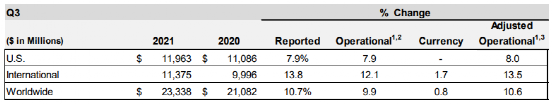 消费者健康业务: 2021年Q3,强生消费者健康业务营收37.00亿美元,同比+4.1%;