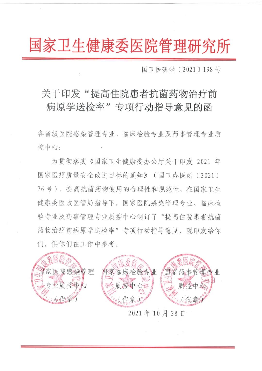 国家卫生健康委于今年年初发布了《2021年国家医疗质量安全改进目标》,提出十项国家医疗质量安全改进目标以及相应的具体阐释和实现目标的核心策略,其中,“提高住院患者抗菌药物治疗前病原学送检率”被明确列为目标之一。