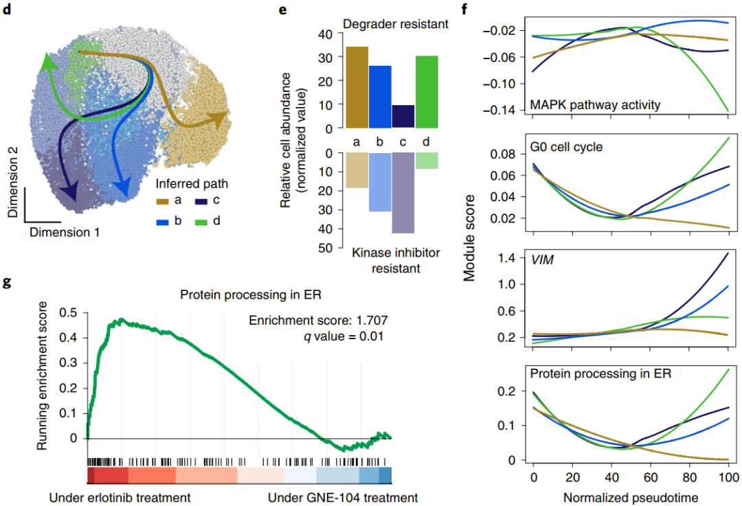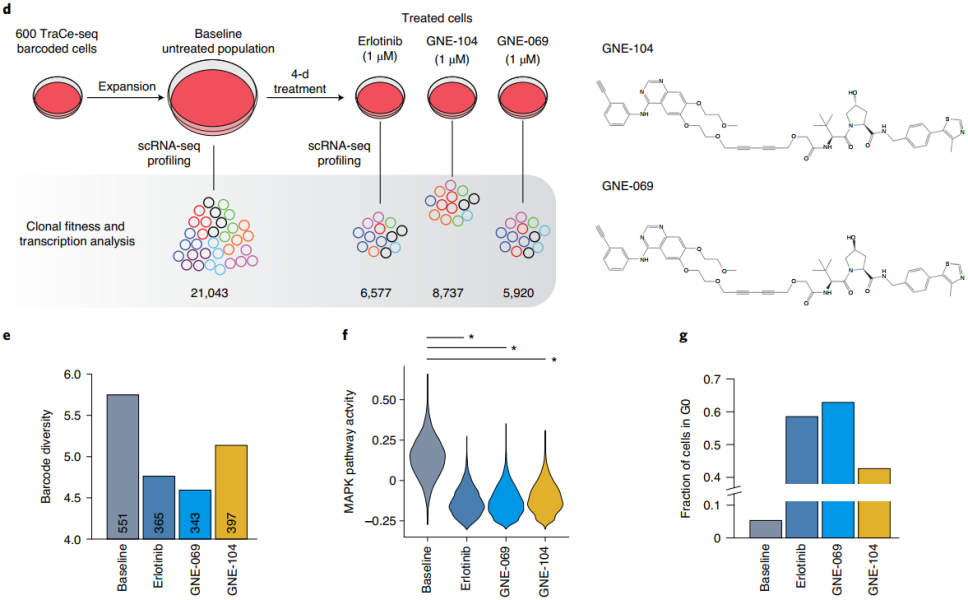 导 读 针对致癌驱动基因突变的靶向治疗为癌症患者提供了显著的临床获益,为精准医疗带来了巨大的希望。但并非所有癌症患者都能产生治疗反应,其他既存的和获得的耐药机制对患者的整体反应和药效持久性提出了巨大的挑战。近年来,靶向蛋白降解这一新的作用机制 (MOA) 引起了人们的广泛关注。与传统的基于占位的靶向抑制不同,异质双功能靶向蛋白降解物能够同时将E3泛素连接酶富集到目标位置,并通过泛素介导的蛋白质水解诱导靶向降解的分子,并被证明在特定情况下优于单独的酶抑制。但目前尚不清楚双作用抑制剂-降解剂是否具有普遍优势。 为了解决上述难题,美国Genentech公司研究团队开发了一个名为TraCe-seq (Tracking differential clonal response by scRNA-seq) 的系统,能够同时跟踪肿瘤起源并比较肿瘤细胞对不同疗法的即时反应,大大加速药物反应机制或者耐药机制的研究。近日,这一研究成果以“Identifying transcriptional programs underlying cancer drug response with TraCe-seq”为题在线发表在Nature Biotechnology。 文章发表在Nature Biotechnology 主要研究内容 为了开发TraCe-seq,研究团队构建了一个与3'端单细胞转录组测序(scRNA-seq)兼容的基于慢病毒的条形码库。每个条形码30个核苷酸组成,具有10万多种不同的组合。此外,研究人员还设计了一个8核苷酸大小的子库索引,以灵活控制总库大小。成功转导后,慢病毒载体将稳定整合到基因组中,使选择性标记、嘌呤霉素抗性和增强型绿色荧光蛋白 (eGFP) 的组成型表达。 图1. TraCe-seq构建和作用模式图。图片来源:Nature Biotechnology 1. TraCe-seq捕获了双重EGFR抑制剂-降解剂的较差活性 EGFR靶向治疗是精准肿瘤治疗的代表性方法之一,因此,研究人员试图使用TraCe-seq来更好地了解EGFR发挥疗效的独特MOAs。虽然靶向EGFR的小分子策略专注于抑制其酶活性,但相对于酶抑制,对EGFR降解的潜在结果知之甚少。为此,研究团队开发了GNE-104,一个由EGFR抑制剂厄洛替尼组成的异源双功能降解物。 为了进行TraCe-seq实验,研究团队随机选取600个携带独特条形码的PC9细胞,将这些细胞扩增12倍,对部分细胞进行了约30倍条形码覆盖率的单细胞转录测序分析,以记录基线转录特征和相对克隆丰度。数据分析结果显示,GNE-104处理在减少TraCe-seq条形码的绝对数量和多样性方面效果较差。此外,虽然在所有处理条件下均观察到类似的MAPK通路抑制,但厄洛替尼和GNE-069诱导的细胞周期阻滞远远大于GNE-104,表明GNE-104处理允许更多的细胞在MAPK通路抑制的情况下持续存在。 图2. 双重EGFR抑制剂-降解剂较差的疗效。图片来源:Nature Biotechnology 2. TraCe-seq揭示了双重EGFR抑制剂-降解剂的不同转录反应和耐药机制 为了进一步了解PC9细胞在克隆水平上对这些处理的不同反应,研究团队将TraCe-seq条形码进行分类,发现TraCe-seq条形码在治疗群体中比未治疗群体的比例高,并被分为三类耐药克隆。特别地,与激酶抑制剂治疗相比,GNE-104治疗导至了一组独特的TraCe-seq条形码的过度表达,这被归类为抗降解的特性。 图3. TraCe-seq揭示了不同类型的耐药克隆。图片来源:Nature Biotechnology 研究人员探索了药物敏感克隆与耐药克隆在基线状态下的基因表达差异。激酶抑制剂耐药克隆与敏感克隆之间的基线基因表达比较结果发现,在治疗前,激酶抑制剂耐药细胞中的VIM和AXL显著上调,证实了TraCe-seq能够成功捕获预期的耐药亚群体和相关的分子标记。抗降解克隆仅表现出AXL的表达升高,没有表现出VIM的上调,表明它们确实在转录上与激酶抑制剂抗性克隆不同。此外,在这些耐降解克隆中,与GNE-104治疗相比,厄洛替尼治疗诱导的内质网途径的蛋白质加工是最丰富和最重要的途径。 图4.基于转录组的不同演化路径的分析。图片来源:Nature Biotechnology 3. 内质网应激程序的缺失增强了EGFR小分子抑制剂的细胞毒性活性 为了进一步验证内质网应激在EGFR激酶抑制剂疗效中的作用,研究人员利用实验抑制剂ISRIB特异性阻断内质网应激下游的前死亡基因的过度激活。在PC9和NCI-H1975细胞中,ISRIB处理确实钝化了由EGFR激酶抑制剂诱导的ATF4、DDIT3和PPP1R15A的激活,并降低了细胞杀伤疗效。相反,在极低的无毒浓度下,添加内质网应激诱导剂则可极大地诱导了内质网应激基因的表达,并增强了降解剂GNE-104在PC9细胞中的细胞毒活性。 结 语 综上所述,TraCe-seq平台能够识别影响不同治疗结果的既有和自适应转录特征。通过追踪暴露于不同的EGFR靶向治疗后有反应和持续存在的细胞,并进行差异基因分析和假时序轨迹比较,研究团队发现了不同MOAs的EGFR靶向药物的细胞机制之间的差异,揭示了EGFR抑制剂反应中一个令人兴奋且此前未被重视的部分:由于抑制结合的EGFR而诱导内质网应激是实现充分疗效的关键。 |
