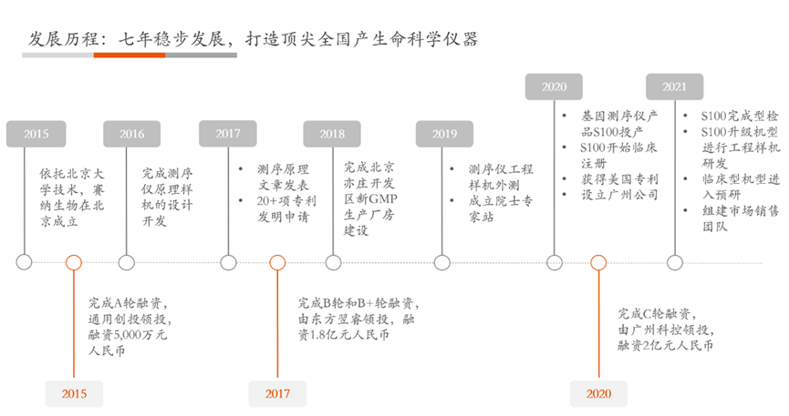 2015年,依托国际首创的荧光发生(Fluorogenic)测序化学和纠错编码(ECC)测序策略两项核心测序技术,毕业于北京大学的陈子天博士联合谢晓亮院士、黄岩谊教授团队创立了赛纳生物。秉承“通过技术拓展知识边界”的企业愿景,赛纳生物致力于通过不断的技术迭代和革新,持续拓展和突破知识边界,以一流的技术和产品重新定义“中国制造”,打破目前由外资企业垄断的测序市场现状,构建中国主导的测序新生态。历经7年的稳步发展,赛纳生物成功研发生产了拥有全自主知识产权的国产基因测序平台S100,可为基因行业提供更准确、简便、快速的上游解决方案。2020年,测序平台S100投入生产并开始临床注册,预计2022年可获得上市许可。