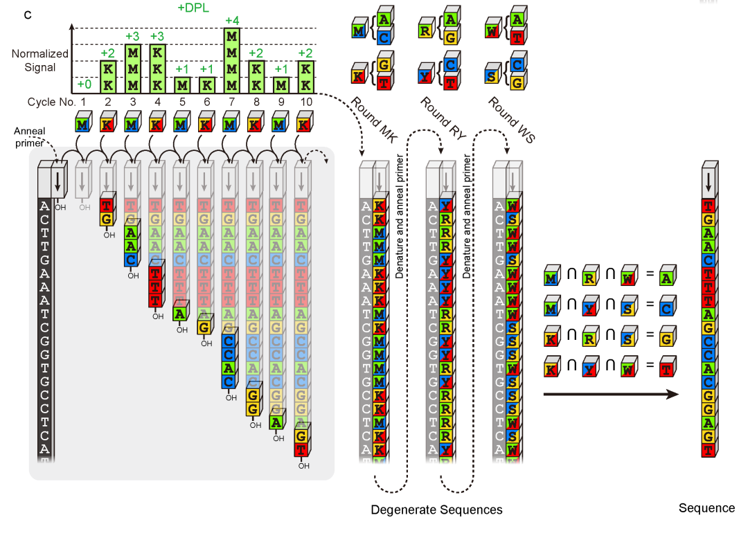 基于荧光发生(Fluorogenic)测序化学,谢晓亮院士、黄岩谊教授课题组深耕4年陈子天博士及同事历经种种挑战与考验,从化学原理上对荧光发生测序技术中的荧光标记分子进行结构优化,设计合成了反应性能出色的新型荧光核苷酸测序底物;对聚合酶参与的物理化学反应过程进行测试及建模;优化测序反应条件和信号采集流程;开发信息论编码解码等等,经过无数次改进、重复,开发了纠错编码(ECC)测序策略,大幅提升了高通量测序的准确度。该成果已于2017年发表于国际顶级学术期刊Nature Biotechnology