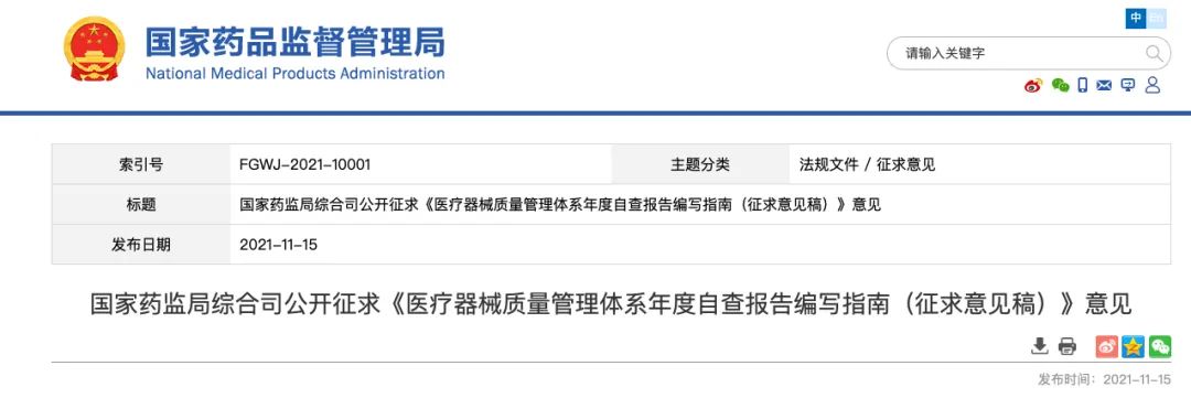 点评:年度自查报告越来越务实! 来源: 为做好《医疗器械监督管理条例》配套文件制修订工作,国家药监局组织起草了《医疗器械质量管理体系年度自查报告编写指南(征求意见稿)》(见附件),现向社会公开征求意见。请将意见反馈至电子邮箱:huangguangshun@126.com。请在邮件主题处注明“自查指南反馈意见”。 反馈意见截止时间为2021年11月30日。
