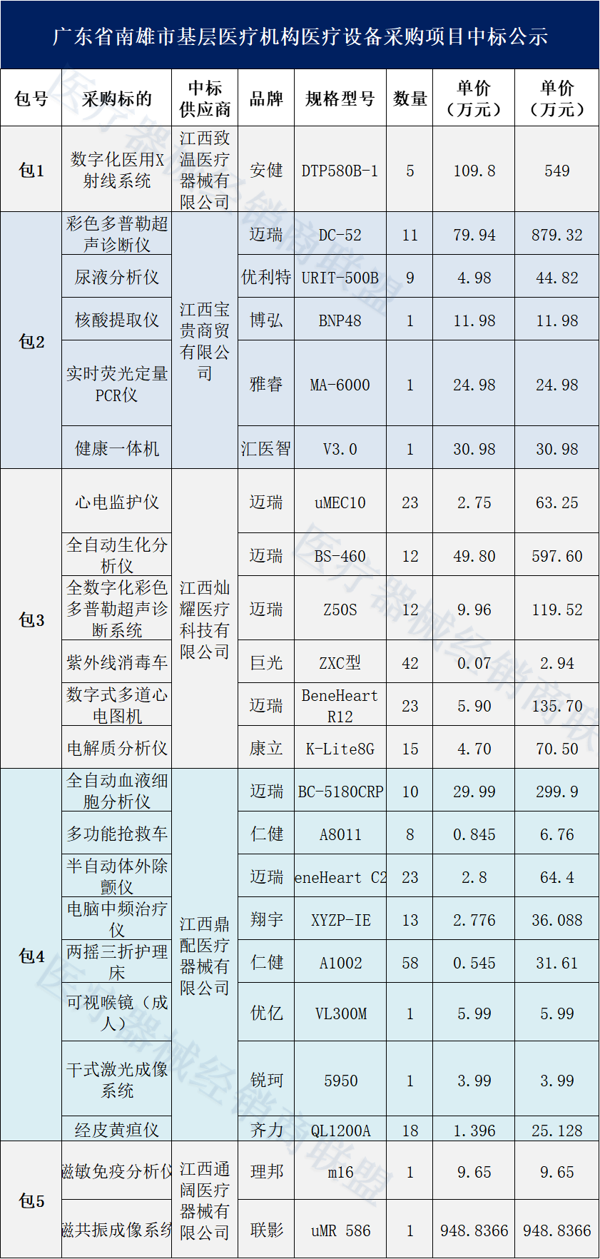 近期,又一地大批医疗器械采购尘埃落定,所有中标产品均为国产,迈瑞、安健、理邦、联影...... 千万采购大单尘埃落定 迈瑞、安健、理邦、联影...... 据中国政府采购网了解,广东省南雄市卫生健康局发布了一则招标公告,总预算近4000万为南雄市基层医疗机构采购一批医疗设备。 主要产品包括,磁共振成像系统、数字化医用X射线系统、彩色多普勒超声诊断仪、全自动生化分析仪、全自动血液细胞分析仪等22种医疗设备。 从结果的公布来看,本次千万级医疗设备采购大单中,国产医疗设备再次大获全胜,289台/套医疗设备最终中标价为3963万,全部为国产,迈瑞、安健、理邦、联影、优利特、翔宇等多家国产品牌中标。 包1总价为549万 数字化医用X射线系统5套,安健中标,单价格为109.8万 包2总价为992万 彩色多普勒超声诊断仪11台,迈瑞中标,单价格为79.94万; 尿液分析仪9台,优利特中标,单价格为4.98万; 核酸提取仪1台,博弘中标,单价格为11.98万; 实时荧光定量PCR仪1台,雅睿中标,单价格为24.98万; 健康一体机1台,汇医智中标,单价格为30.98万; 包3总价为989.5万 心电监护仪23台,迈瑞中标,单价格为2.75万; 全自动生化分析仪12台,迈瑞中标,单价格为49.8万; 全数字化彩色多普勒超声诊断系统12套,迈瑞中标,单价格为9.96万; 紫外线消毒车42台,巨光中标,单价格为700元; 数字式多道心电图机23台,迈瑞中标,单价格为5.9万; 电解质分析仪15台,康立中标,单价为4.7万; 包4总价为473.9万 全自动血液细胞分析仪10台,迈瑞中标,单价为29.99万 多功能抢救车8台,仁健中标,单价为8450元; 半自动体外除颤仪23台,迈瑞中标,单价为2.8万; 电脑中频治疗仪13台,翔宇中标,单价为2.776万; 两摇三折护理床58个,仁健中标,单价为5450元; 可视喉镜(成人)1个,优亿中标,单价为5.99万; 干式激光成像系统1套,锐珂中标,单价为3.99万; 经皮黄疸仪18台,齐力中标,单价为1.396万; 包5总价为958.5万 磁敏免疫分析仪1台,理邦中标,单价为9.65万; 磁共振成像系统1套,联影中标,单价为948.8366万; 基层医疗机构设备采购 首选国产 值得关注的是,南雄市卫生健康局公布的招标文件中,直接表明仅采购本国产品,若投标人提供进口产品,视为无效投标。 众所周知,为支持国产医用设备推广应用,广东省此前就发文表示,在不违反现行法律的前提下,严格执行《政府采购进口产品管理办法》,政府采购应当采购本国产品。 特别是一些大型医疗设备,明确市(县)级以下医疗机构首次配置大型医用设备的,以及市(县)级医疗机构配置第2台及以上的、地级市以上的医疗机构配置第3台以上的、明确用于特定专科使用的,原则上应选择国产设备。 同时,广东省还简化配置国产大型医用设备的审批程序,优化审批服务,将乙类大型医用设备配置的许可时限由法定的20个工作日调整为8个工作日,落实“马上办、网上办”。 不得不说,广东省在支持国产医疗设备上花费了不小的力气,特别是在《政府采购进口产品清单管理制度》严格实施之下,大批国产医疗器械品牌在政府采购中,增添了诸多优势。 而不仅仅是广东省,近年来多省发文明确支持国产医疗设备,除非中国境内无法获取或者无法以合理的商业条件获取,以及法律法规另有规定确需采购进口产品的,均须优先采购国产医疗设备。 并且,不得限制国产设备参与竞争,如因信息不对称等原因,仍有满足需求的国内产品要求参与采购竞争的,按照公平竞争原则实施采购,不得对其加以限制。 |