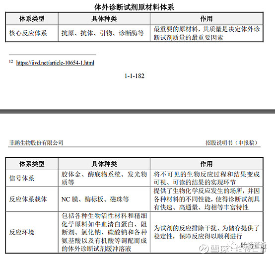 公司介绍 菲鹏生物,成立于2001年,2021年10月递交招股书,用时20年。成立时定义自己为体外诊断核心原料供应商,现在定义自己为:体外诊断整体解决方案供应商 历史估值 2017年8月,股权转让,估值70亿 2018年8月,增资,估值投前80亿 2020年8月,老股转让,估值200亿 公司主要业务:三部分 一、体外诊断试剂原料 二、体外诊断仪器解决方案(主要产品为仪器) 三、体外诊断试剂解决方案(主要产品为试剂半成品,即试剂核心组分) 疫情期间,公司业务得到了巨大的提升,2020年收入10.6亿,2021H1收入11亿。 (1)体外诊断试剂原料 公司的体外诊断试剂原料按照产品性质的不同,可分为核心反应体系原料,如抗原、抗体、诊断酶等,以及非核心反应体系原料,如底物、标准品等,共1,300 余小类。抗原、抗体、诊断酶(让人想起诺唯赞)等是体外诊断试剂产业上游最重要的关键要点,其质量是决定体外诊断试剂质量的最重要因素。 公司有4个原料平台,生化、免疫/发光、分子诊断、POCT,对应十余种疾病诊断领域。非常优秀。(IVD六七种赛道,生化、免疫、分子诊断、POCT、血球、体液诊断等,生化红海,免疫如日中天,分子诊断是未来,POCT是应用场景的延展,红海但增长快。比如迈瑞是血球老大,免疫/发光的四强之一。但是迈瑞没有吃疫情这波红利,失败) (2)体外诊断仪器解决方案 公司自 2017 年开始着力建设体外诊断仪器平台,并将此作为共建开放诊断生态中的重要工具。目前,公司已重点布局了化学发光仪器平台、基因测序仪平台、POCT 分子诊断仪器平台及荧光免疫仪器平台。 化学发光竞争比较激烈,是否能跑出来不知道,新产业、迈克、迈瑞、安图等都很强。 基因测序仪平台,我们在华大智造里讲过,非常难,而且要求平台+应用。一旦建设成功,非常非常厉害,那就有第二个国产平台来打破垄断了。 POCT和荧光免疫就很红海了,基蛋、明德、艾德等等多家上市企业及非上市企业。 公司化学发光仪器可兼容直接化学发光和酶促化学发光等主流检测体系,2020 年度销售 183台,2021 年上半年销售443 台,销售增长较快。 公司高通量基因测序仪平台由被投公司 SequLITE 开发(未来会100%控股)。SequLITE 团队已完成了首款桌面型中低通量基因测序仪(SeqQ 100)功能样机的研发,目前正在对该产品进行测试优化。截至本招股说明书签署日,SequLITE 尚未取得销售收入。 公司 POCT 分子诊断仪器平台由控股子公司润鹏生物开发与运营,目前有全自动核酸检测、快速 PCR 以及高通量全自动肿瘤突变检测等三个应用平台,截至本招股说明书签署日,润鹏生物尚未取得销售收入。 (3)体外诊断试剂解决方案 公司重点聚焦化学发光、分子诊断和生化诊断试剂半成品的开发,并为客户提供试剂开发方案。 公司2018年收入2.2亿元,2019年收入2.89亿元,主要收入来自于抗原、抗体和诊断酶。2020年收入10.6亿,2021年H1收入11亿,原料收入占比仍然为80%左右,小部分是设备+试剂半成品。 公司从原料,切入IVD下游(和诺唯赞一样),也是受到疫情的影响,手里有钱了,正好大干一场。和诺唯赞一样,也都是起步阶段,未来是做大,还是因此会丢失客户,是个未知数,需要观察至少2年。 行业介绍:IVD产业链(之前诺唯赞、义翘神州都是生物试剂领域,菲鹏生物的涉及行业更加广泛) 一:体外诊断行业 体外诊断是指在人体之外通过对人体的样本(如血液、体液、组织等)进行检测而获取临床诊断信息的产品和服务。 我国 2019年体外诊断上游核心原料及仪器元件的市场规模在 200 亿元左右,中游体外诊断仪器及试剂的市场规模约800 亿,而下游面向终端用户的体外诊断服务市场规模达到近2,000 亿。 全球体外诊断行业市场规模从 2015年约 566亿美元增长至 2019 年约 688亿美元,期间年化复合增长率约 5.0%。 中国体外诊断市场规模从 2015年约人民币 427.5 亿元增长至 2019 年约人民币 805.7 亿元,期间年化复合增长率达到 17.2%。(这个增速不错了) 2019 年中国化学发光免疫诊断市场规模约为人民币 220.6 亿元,预计 2030年将增长至人民币 1,034.6 亿元,期间年化复合增长率达 15.1%。 中国 PCR 诊断市场发展迅速,市场规模迅速从 2015 年的约人民币23.7 亿元增长至2019 年约人民币59.3 亿元,期间年化复合增长率达25.8% 2019 年,非科研体外诊断行业中,以成本价计算,非科研用基因测序诊断市场规模约为人民币21.3 亿元。随着国产基因测序平台的陆续上市(华大智造、菲鹏自己?),预计到 2030年将达到人民币 126.0 亿元,2019 年至 2030 年期间年化复合增长率可达约17.5% 全球高通量基因测序仪及耗材行业集中度极高,按收入计算,2019 年超过99% 的市场份额由 Illumina 、Thermo FisherScientific,华大智造,PacificBioSciences(PacBio) 和 OxfordNanopore Technologies (ONT) 这 5 家公司瓜分。 二:体外诊断原料市场概况 原理:太多太复杂,我也看的有点晕,略。 内容:如图所示 市场规模及增速 2019 年全球体外诊断试剂原料市场规模预计约为人民币303.3 亿元,其中,中国市场的规模预计约为人民币 62.9 亿元(800亿总市场,扣掉设备,占比大约10%)。增速与行业增速平行。 竞争格局:数量多,体量小,分散度高(所以菲鹏和诺唯赞都向下游IVD延伸) 全球体外诊断试剂原料市场突出地体现为参与者众多、个体规模较小、行业高度分散的特点,即使像菲鹏生物、HyTest(被迈瑞5.45亿欧元收购)、BBISolution、Meridian 等头部企业的全球市场份额仅在 5%左右,而大量中小