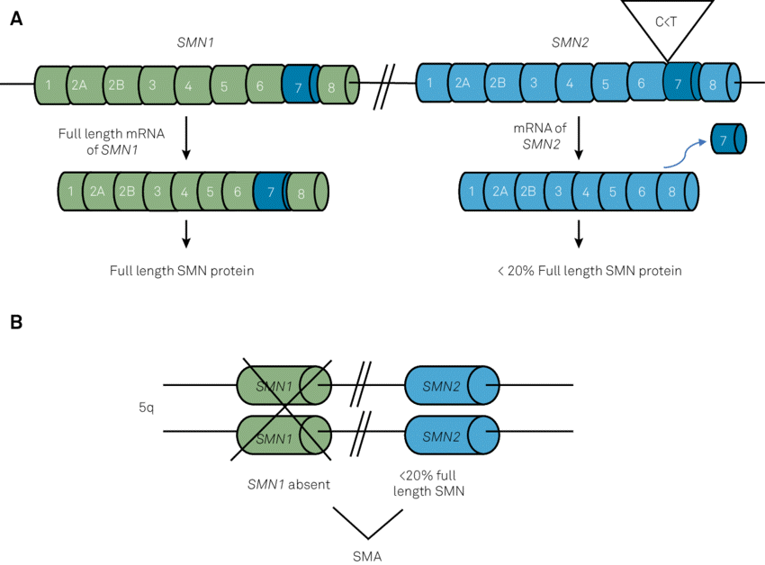 科学研究表明,SMA是由体内的SMN1基因和SMN2基因突变引起的,正常的SMN1基因编码运动神经元生存蛋白(SMN蛋白),这是神经和运动功能所必需的。突变的SMN1基因使体内不能产生正常的SMN蛋白,导至骨骼肌萎缩,进一步影响SMA患者的运动、吞咽和呼吸能力。SMN2基因也能编码SMN蛋白,但一个特殊的同义点突变导至pre-mRNA剪切,跳过第7外显子的概率约为90%,生成的转录产物是不稳定的Δ7截短型蛋白,极易降解,从而无法发挥完整SMN蛋白的正常生理作用,详见图1。