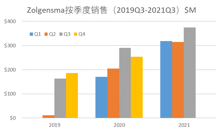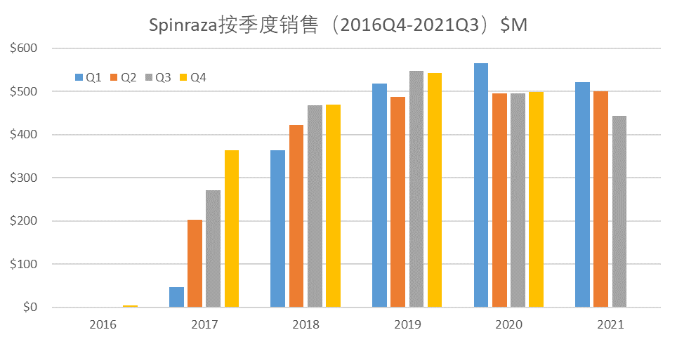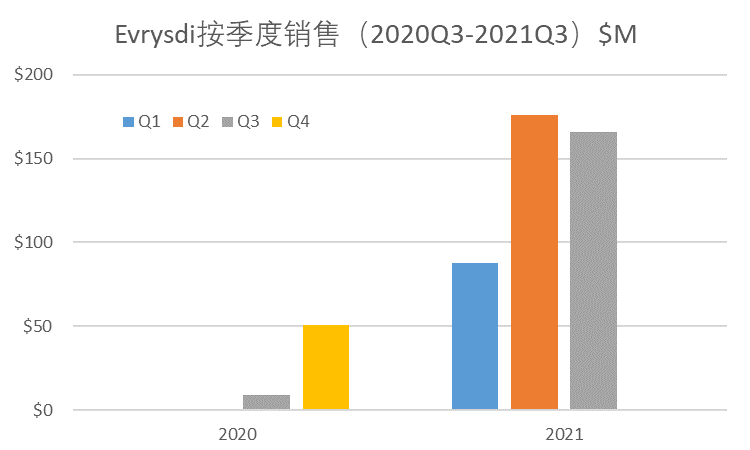 图7 Spinraz、Zolgensma、Evrysdi上市后的逐季销售(单位:百万美元)