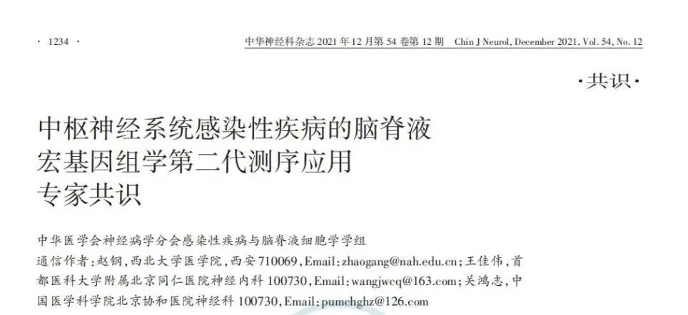 摘要 宏基因组学第二代测序(mNGS)可以非靶向地检测临床标本中存在的细菌、真菌、病毒和寄生虫等病原体的核酸。在中枢神经系统(CNS)感染性疾病的病原体诊断方面,脑脊液 mNGS 技术已逐步应用于临床。为推进脑脊液mNGS的合理应用,国内首篇脑脊液mNGS的共识-“中枢神经系统感染性疾病的脑脊液宏基因组学第二代测序应用专家共识”于2021年12月在《中华神经科杂志》发表。 该共识由中华医学会神经病学分会感染性疾病与脑脊液细胞学学组撰写,西北大学医学院赵钢教授,首都医科大学附属北京同仁医院王佳伟教授,中国医学科学院北京协和医院关鸿志教授为通信作者,复旦大学附属中山医院冯国栋教授、中国医学科学院北京协和医院范思远作为执笔,从mNGS应用概况,临床适应证和送检时机,标本的管理、检测、报告及实验室质控,报告的临床解读等方面提出了规范化意见。 mNGS的应用概况 2014年,国际上开始报告使用mNGS诊断神经感染病例。2015年以来,脑脊液 mNGS在国内逐渐应用于神经系统感染性疾病的诊断。此后,国内外开展了一系列队列研究: