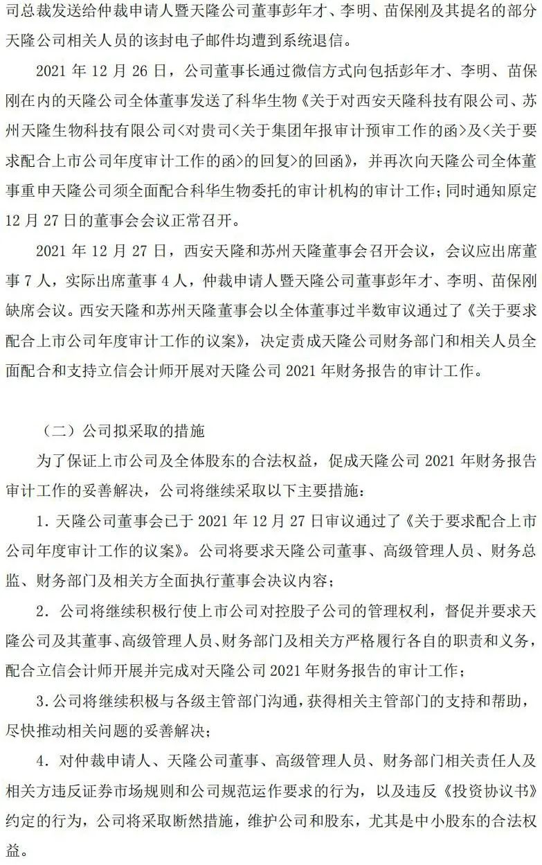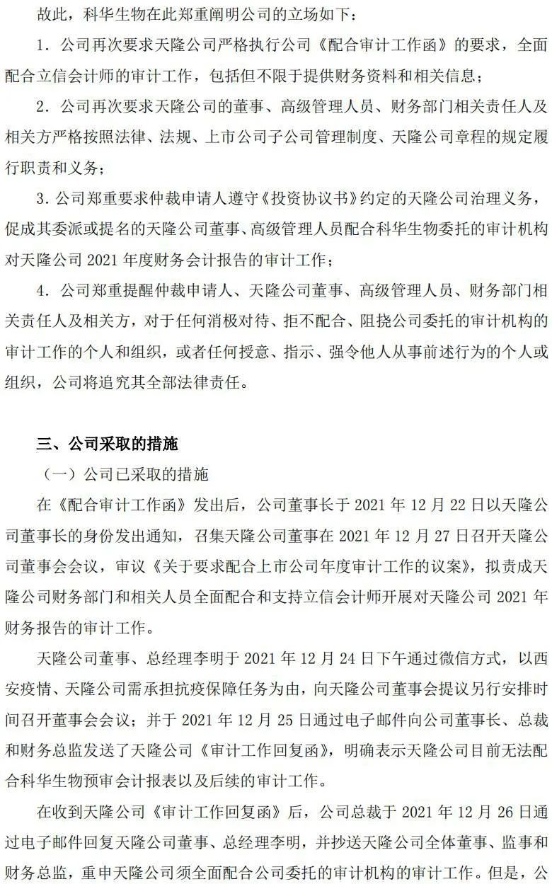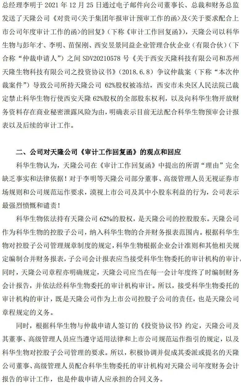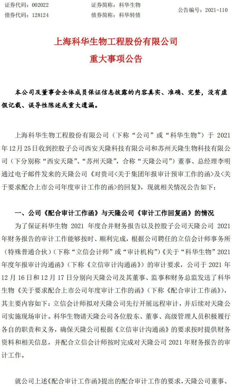 科华生物公告,公司依法持有天隆公司62%的股权,是天隆公司的控股股东。天隆公司以向公司开放财务资料存在商业秘密泄露风险等为由,明确表示目前无法配合科华生物预审会计报表以及后续的审计工作。