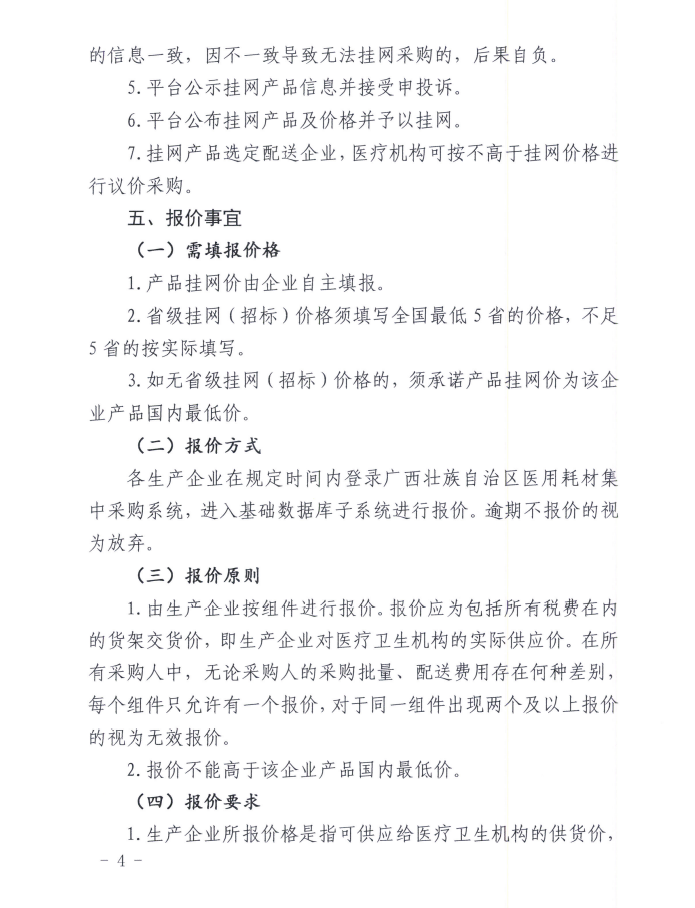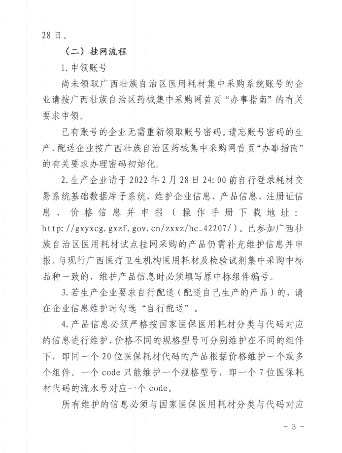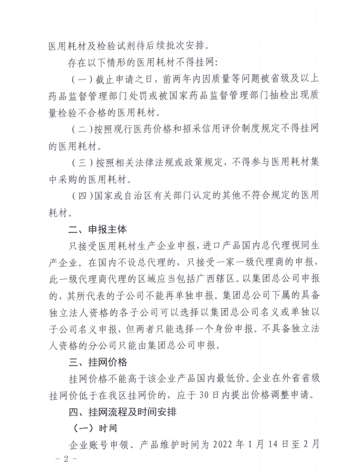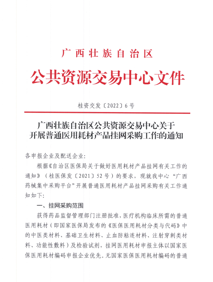 2022年1月14日,广西公共资源交易中心发布《关于开展普通医用耗材产品挂网采购工作的通知》,企业账号申领、产品维护时间为2022年1月14日至2月28日。 挂网范围:国家医保局发布的《医保医用耗材分类与代码》中的中医类耗材、基础卫生材料、止血防粘连材料、注射穿刺类材料、功能性敷料;检验试剂。