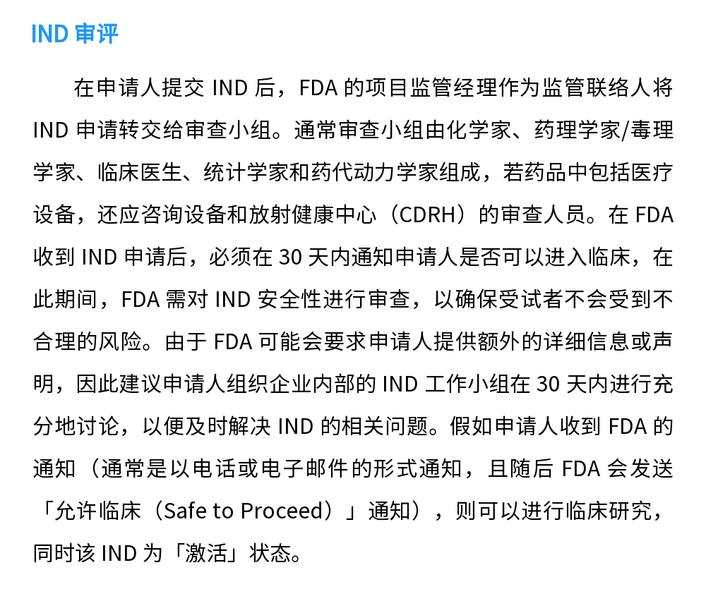 新药临床试验申请(Investigational New Drug Application,IND)是美国 FDA 对尚未上市审批、需要进行临床试验的药物的许可。另外,美国联邦政府禁止未获 FDA 批准的药品在美国进行跨洲际间运输和分发,因此,对于主办者将药品运输到外州进行临床试验的情况,IND 也是申请对这项法律条款的豁免权。