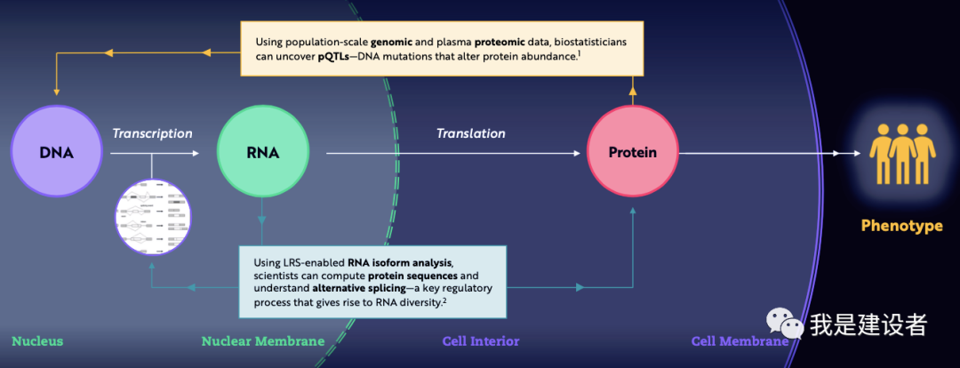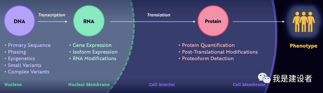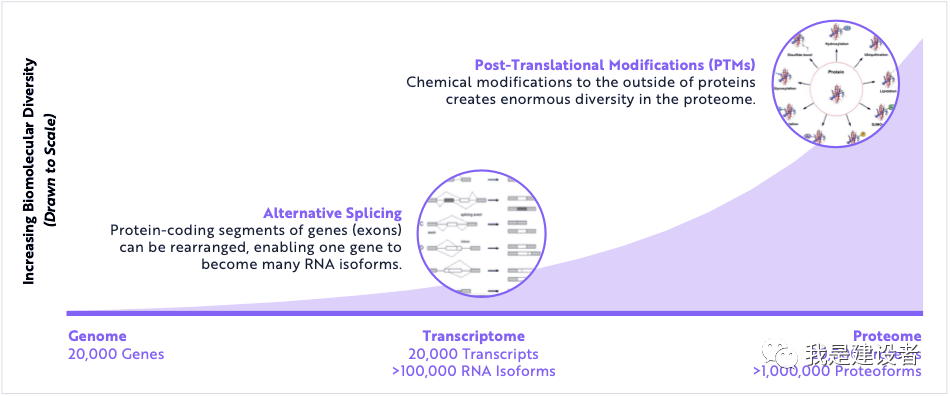 生命科学领域的中心法则描述了信息如何在生物系统中流动。简单来说,中心法则指出 DNA(基因组)被转录成 RNA(转录组),RNA 最终被翻译成蛋白(蛋白质组)。中心法则的每一层都增加了系统的复杂性。虽然我们基因组中的约 2万个基因理论上对应了约 2万种典型的蛋白质,但转录组和蛋白质组可以包含数十万个独特的分子,这其中包括选择性剪接和翻译后修饰(PTM)等生物过程增加了其多样性和复杂性。了解中心法则这几个支柱之间的相互作用,将提高我们做出预测、诊断和实现生物学洞察提升的能力。