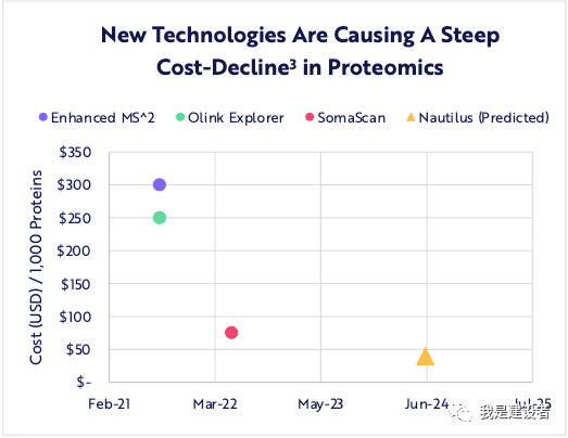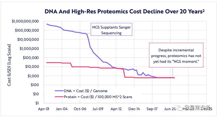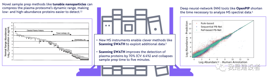 然而全面的临床蛋白质组学因多种原因限制而面临挑战,包括其高成本的限制。事实上,基因组学和高分辨率蛋白质组学成本在 20 年内都呈现了下降,但尽管取得了进展,蛋白质组学却并没有迎来“NGS 的高光时刻”。 新技术的不断出现导至蛋白质组学成本的显著下降,同时质谱 (MS) 作为一种分析复杂蛋白质组样本的常用方法也正在复兴。MS 利用蛋白质的不同质量和电荷对蛋白组进行分析。但因为它需要手动,MS 难以扩展,无法检测血浆中的一些蛋白质。 置于MS方法学两端的新型样品制备和分析技术进步开始解决其缺点,比如:可调控纳米粒子等新型样品制备方法可以压缩血浆蛋白质组的动态范围,使低丰度和高丰度蛋白质都更容易检测;而OpenPIP 等深度神经网络 (NN) 工具缩短了分析 MS 光谱数据所需的时间。新的 MS 仪器支持扫描 SWATH 的巧妙方法可用来探索额外的数据;扫描 SWATH 可将血浆蛋白的检测提高 70%(CV:6.4%),并将样品制备时间缩短至 5 分钟。由于 MS 无处不在,市场很可能会在短期内采用这些技术进步。