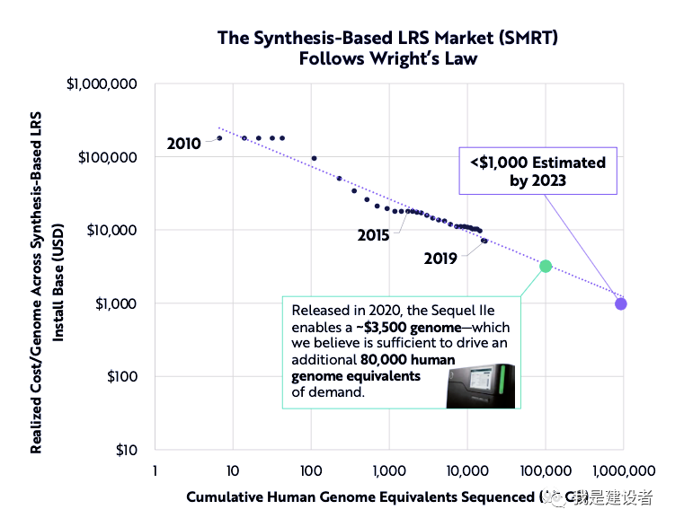 在连续几年关注基因测序及其应用之后,今年ARK的Big Ideas报告直接将多组学提上关注,除了基因测序带动的基因组学技术之外,更关注多组学融合特别是蛋白组学技术的发展。 在去年的报告中,长读长测序及多癌种早筛这两项与基因组学相关的技术被列在15大创新主题中,而经过过去一年的发展,我们也的确看到了这两项技术的快速商业化,并将会在今年持续发展,这里就不做赘述。 NGS是基因组革命的底层驱动力,尽管历史上以短读长测序为主,但长读长测序迅速发展将不断获得市场份额。长读长测序可以提供更完整的人类基因组视图,就像为以前的黑白图像添加色彩一样。长读长测序可以很好的检测并表征更多的结构变异,无需单独制备样本就可以自然捕获甲基化等表观遗传信息,可以识别二倍体基因组,实现远距离定相,更清晰地展示突变是来自于“妈妈这边还是爸爸那边”。事实上,结合使用长读长测序技术,端粒到端粒 (T2T) 联盟最终在2021年发布了完整的人类基因组组装图,与2003 年人类基因组草图序列相比,多发现了 2 亿多个碱基及 1500 个新基因。 长读长测序所带来的前所未有的基因组视图也为揭示以前隐藏的生物学事件提供了新的基础。这依然是基因组学的范畴,但基因组学的发展经验可以为其他组学提供借鉴,尤其是将突破性的发现转化为临床解决方案;借助创新的分析和软件工具,应用于高通量组学,最终可以帮助更好地理解生命、疾病及健康。