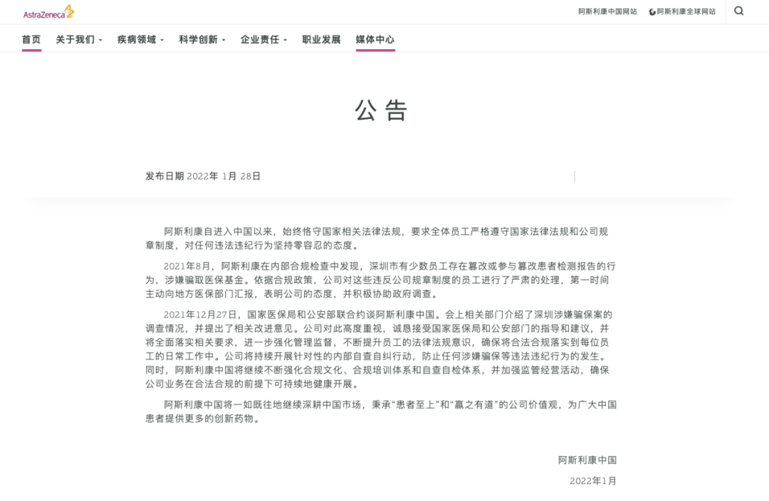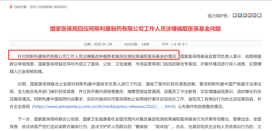 重磅! 1月29日下午,国家医保局在其官方网站首页中发布一封通报。阿斯利康制药有限公司工作人员涉嫌篡改肿瘤患者基因检测结果以骗取医保基金,目前犯罪嫌疑人已全部被批捕。 图:国家医保局发布公告回应阿斯利康工作人员涉嫌骗保问题。国家医疗保障局官网截图 国家医保局基金监管司负责人表示,前期根据群众举报线索,国家医保局督促深圳市成立了医保、公安、卫生健康、市场监管等部门组成的联合专案组,对案件情况进行深入调查,目前犯罪嫌疑人已全部被批捕。 近期,国家医保局联合公安部对阿斯利康中国有关负责人进行了约谈,通报了案件阶段性调查进展,要求阿斯利康中国严格遵守法律法规,全力配合有关部门做好后续调查,并立即开展内部排查整改、堵塞营销监管漏洞,加强员工守法教育、切实增强诚信意识,适时曝光约谈及整改情况。 通报称,阿斯利康中国按照约谈要求,及时对接深圳市医保局和公安局做好案件后续侦办工作,督促员工有类似行为的主动投案自首,并在企业官网公布案件和自查整改情况。 阿斯利康中国做出回应! 阿斯利康公司中国官网在1月28日也发出公告,对该事件进行回应。 图:阿斯利康中国针对此次事件发布的公告。阿斯利康中国官网截图 公告称,2021年8月,阿斯利康在内部合规检查中发现,深圳市有少数员工存在篡改或参与篡改患者检测报告的行为,涉嫌骗取医保基金。依据合规政策,公司对这些违反公司规章制度的员工进行了严肃的处理,第一时间主动向地方医保部门汇报,表明公司的态度,并积极协助政府调查。 国家医保局表示,下一步将联合公安部、国家卫生健康委在全国范围内对篡改基因检测结果骗取医保基金行为开展专项整治,重拳出击,全面排查,依法依规严厉打击此类欺诈骗保行为,坚决守护好人民群众的“看病钱”“救命钱”。在此,也督促相关企业和人员有类似行为的,立即到所在地医保部门和公安部门投案自首,争取宽大处理。 |