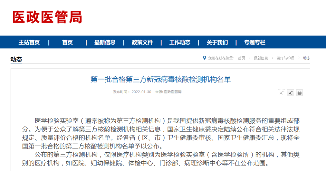 2022年1月30日,国家卫健委医政管理局发布《第一批合格第三方新冠病毒核酸检测机构名单》。这是国家卫生健康委决定陆续公布符合相关法律法规规定、质量评价合格的机构名单。经各省(区、市)卫生健康委审核、国家卫生健康委汇总,现将全国第一批合格的第三方核酸检测机构名单予以公布。