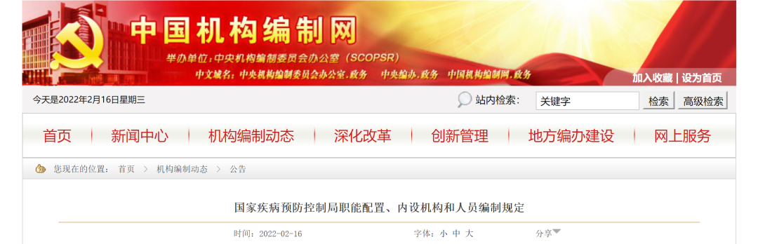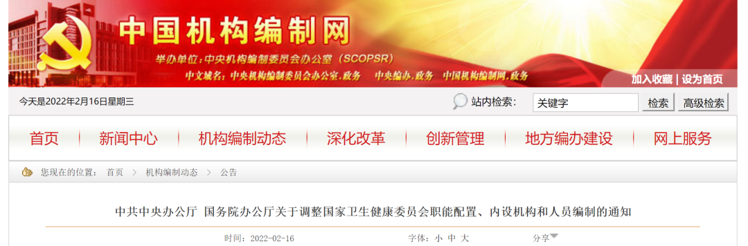2月16日,中国机构编制网发布《关于调整国家卫生健康委员会职能配置、内设机构和人员编制的通知》《国家疾病预防控制局职能配置、内设机构和人员编制规定》。