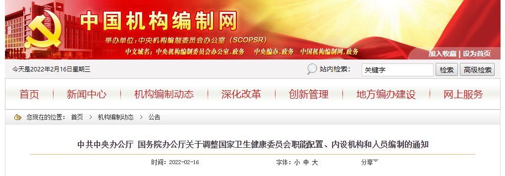 昨日,国务院办公厅发布《关于调整国家卫生健康委员会职能配置、内设机构和人员编制的通知》(以下简称《通知》)。 据赛柏蓝梳理,本次国家卫健委的调整涉及职责、内设机构、人员编制三个方面。一方面,业内呼吁已久的国家疾病预防控制局正式成立,由国家卫健委负责管理,国家卫健委将多项疫病预防、控制职责划归疾控局;另一方面,国家卫健委进一步转变工作职能,全面推进健康中国建设。撤销疾病预防控制局、综合监督局,并将医政医管局更名为医政司,卫生应急办公室(突发公共卫生事件应急指挥中心)更名为医疗应急司。(一)国家卫生健康委员会负责管理国家疾病预防控制局,将下述职责划入国家疾病预防控制局:制定并组织落实传染病预防控制规划、国家免疫规划以及严重危害人民健康公共卫生问题的干预措施,制定检疫、监测传染病目录;组织指导传染病疫情预防控制,编制专项预案并组织实施,指导监督预案演练,发布传染病疫情信息,指导开展寄生虫病与地方病防控工作;负责职责范围内的职业卫生、放射卫生、环境卫生、学校卫生、公共场所卫生、饮用水卫生等公共卫生的监督管理,负责传染病防治监督,健全卫生健康综合监督体系;制定传染病医疗机构管理办法并监督实施。