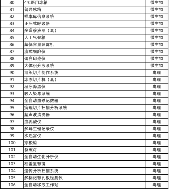 疫情发生后,特别是去年下半年以来,我国边境口岸疫情防控压力明显增大,境外病例输入风险持续攀升。截至2021年11月,边境地区共输入病例1895个。而主要边境地区专业技术人员配备不足,139个边境县中,配备疾控人员不到20人的县就有26个,当地医疗卫生人员不足的问题也进一步突显,严重依赖其他省市或第三方力量支援。 为此,国家发展改革委下达中央预算内投资33.8亿元,支持边境地区加强检测实验室和救治设施设备建设。下一步,国家发展改革委将根据陆路边境省份疫情综合防控情况,继续加大中央预算内投资支持力度,深化提升边境省份常态化疫情防控和集中救治能力。 下表为本网根据国家卫健委规划司于2020年发布的《疾病预防控制中心建设标准(征求意见稿)》所整理的仪器装备配备清单,供广大用户与仪器企业参考: |